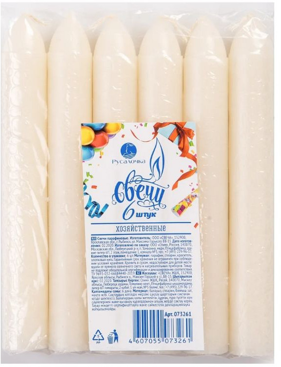 Русалочка Свечи хозяйственныеВ данный момент этот товар отсутствует в продаже. Возможно, у нас найдется аналогичный или похожий товар здесь. Хозяйственные свечи Русалочка изготовлены из парафина, имеют широкое применение в быту, подходят для освещения темного помещения или для украшения интерьера. Время горения свечи около шести часов, глянцевая поверхность имеет презентабельный вид, не стекает по бокам и остается в выгоревшей лунке. |