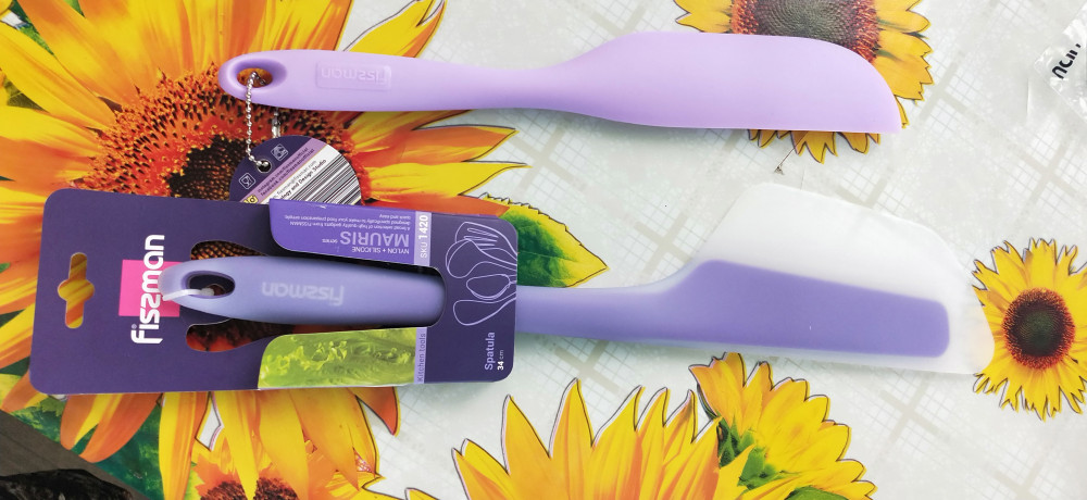 Моя любимица на кухне. Размер лопатки 27 см, 13 см - это ручка, остальные 14 см сама "рабочая сторона". Кончик лопатки около 2 см - гибкий. Ею удобно и размешивать, и остатки теста с миски собрать, и тесто на печенье на силиконовом коврике резать, не боясь за коврик, и готовую выпечку с противня убрать. Лично у меня она работает для выпечки, для горячих блюд я ее не использую.