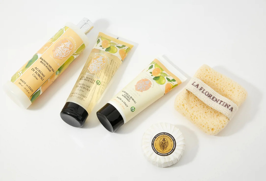 Пена: вода, глицерин, лимонная кислота, пропиленгликоль, линалоол, лимонен, бергамота экстракт, калия сорбат, феноксиэтанол, токоферол, кокамидопропил бетаин, бензиловый спирт, апельсина цветков экстракт, коко-глюкозид, глицерил олеат, оливковое масло, парфюм, динатрия кокоамфодиацетат, лауроил глутамат натрия, тетранатрия глутамат диацетат, содиум мурет сульфат, гликоль дистеарат, стирен-акрилат сополимер, хлорид натрия.