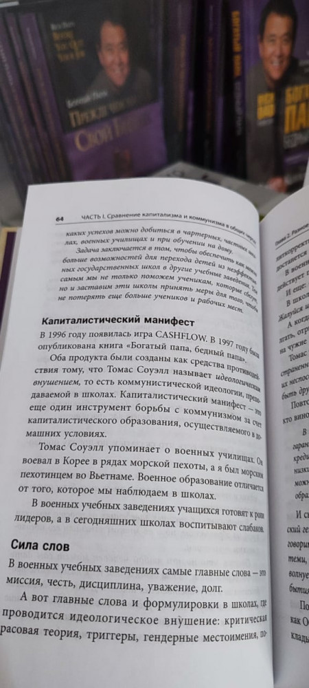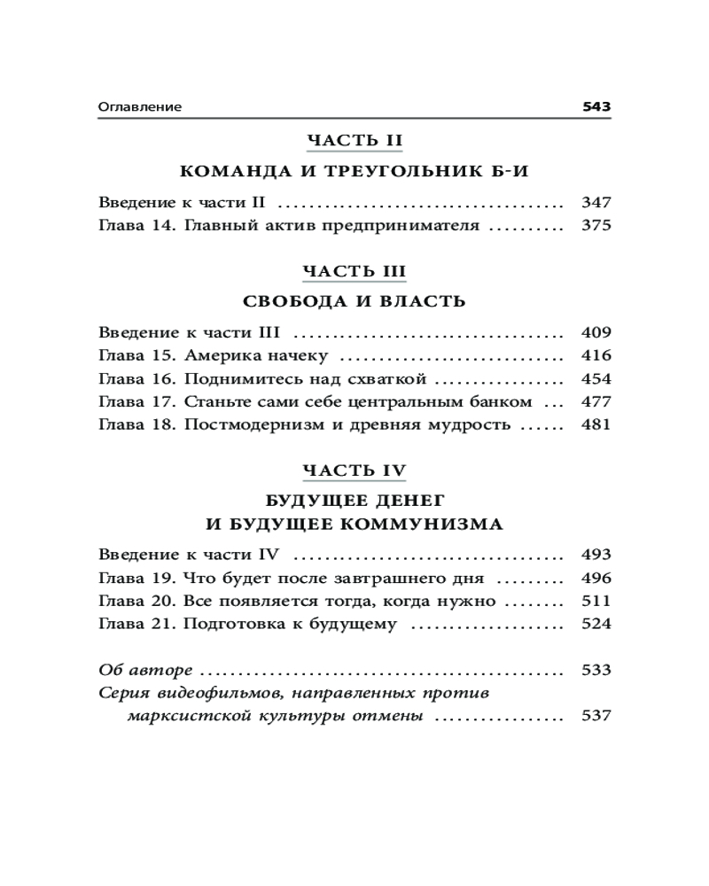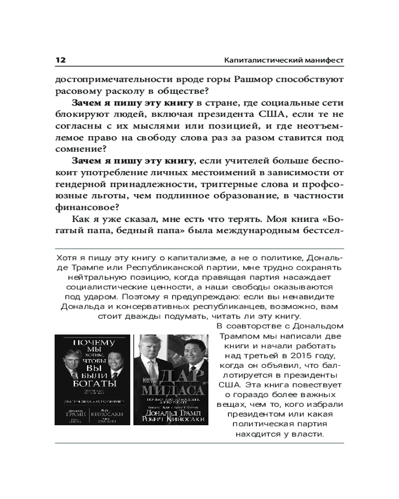 В последних книжках Роберт всё больше пишет о политике разнице между коммунизмом и капитализмом, рынке РЕПО, теневой банковской системе в купе с образовательной системой, как они влияют на обычных людей и даже на Дональда Трампа. Здесь он разбирает "Манифест коммунистической партии" написанный Карлом Марксом и даёт разъяснения с точки зрения предпринимателя и инвестора. Всё самое интересное на странице 458.