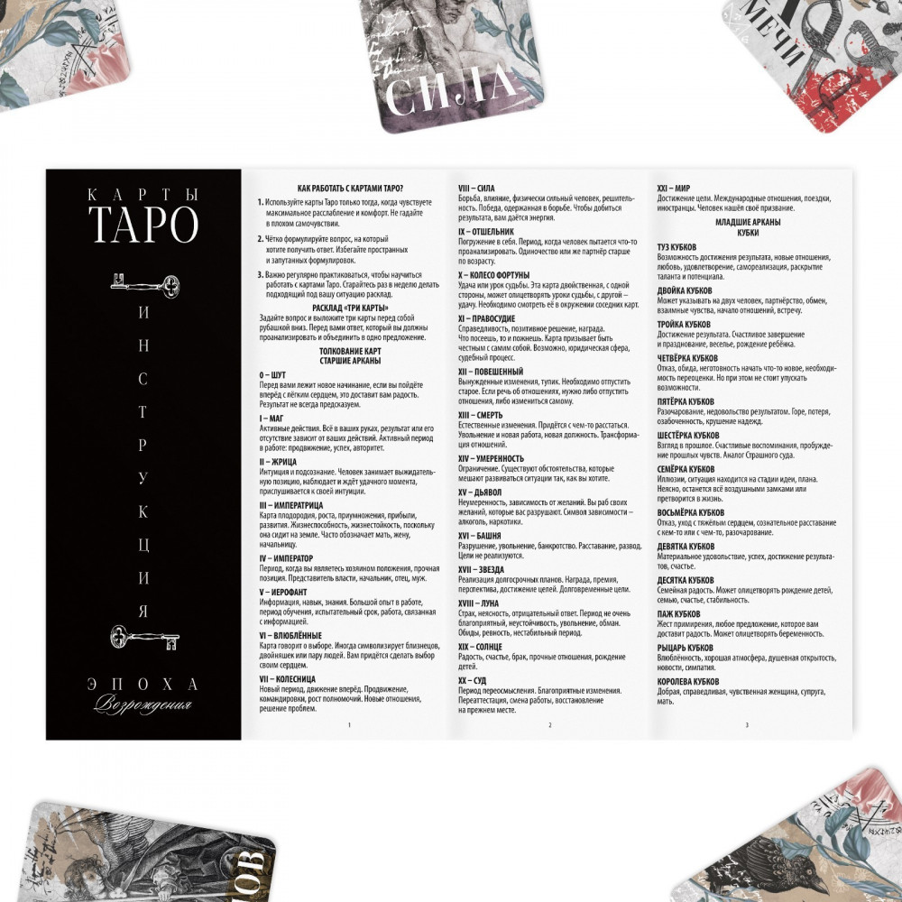 💳 Оплатить за товар можно при получении 🇰🇿 Есть бесплатная доставка по Казахстану от 1 дня 🎁 Копите бонусы с каждой покупки Таро — древнее и популярное карточное гадание. Оно позволяет найти ответы на вопросы разного рода, а также получить совет от карт, понять причины своих поступков и поведения других людей. Колода карт Таро «Эпоха Возрождения» поможет вам прояснить ситуацию и сконцентрироваться на ключевых моментах. Просто задайте вопрос и получите долгожданный ответ. |