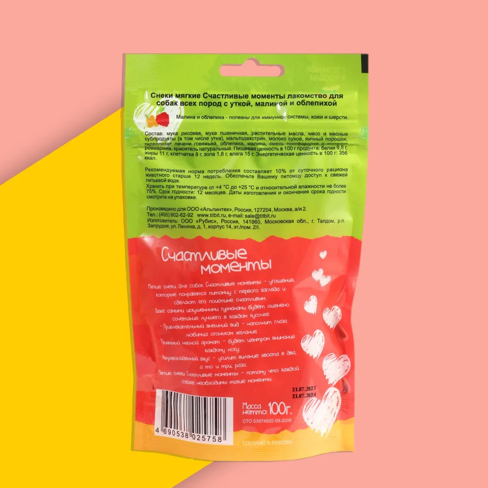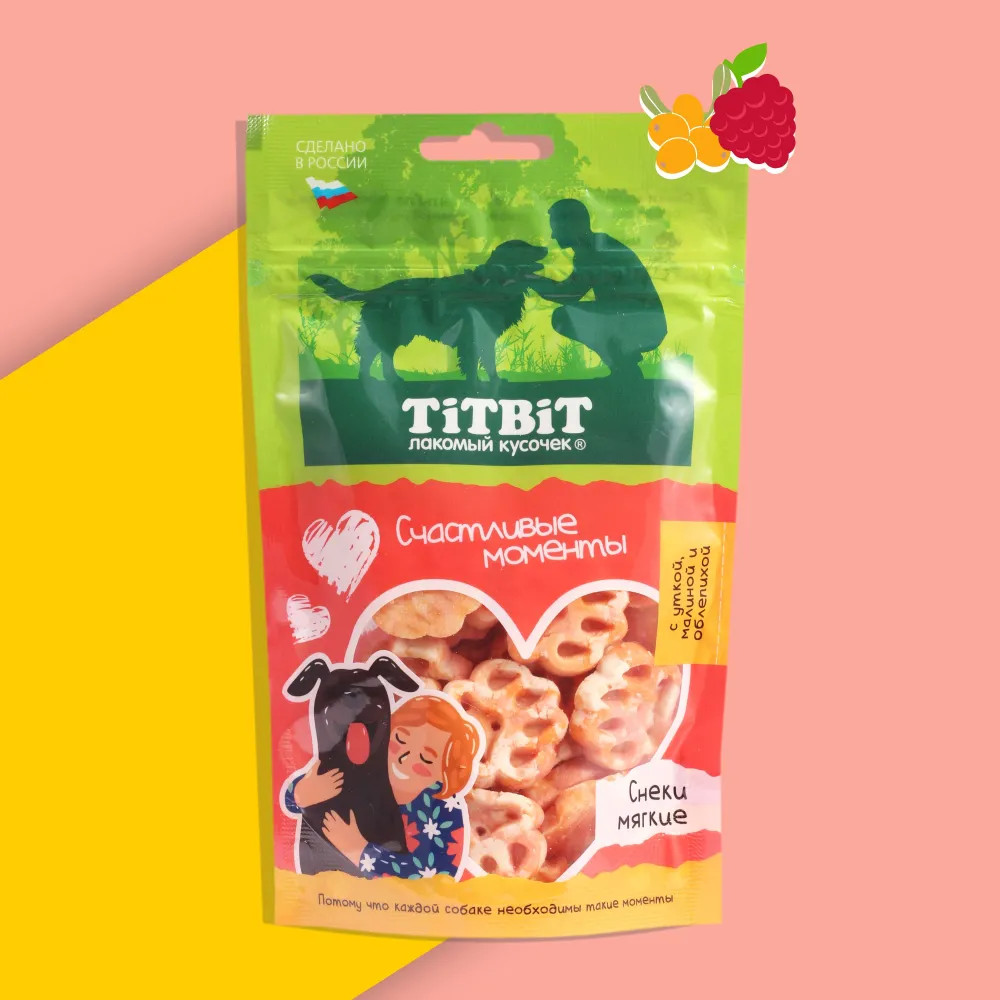 TiTBiT Лакомство для собак всех пород «Снеки мягкие с уткой, малиной и облепихой «Счастливые моменты»