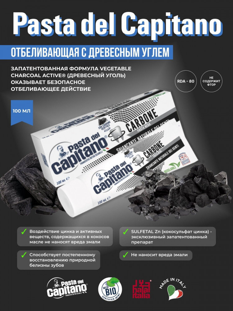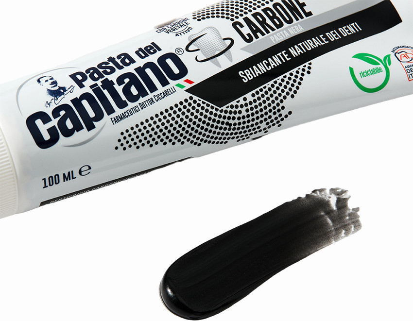 Формула зубной пасты Pasta del Capitano с древесным углем в качестве активного компонента оказывает безопасное отбеливающее действие, предотвращает появление неприятного запаха (галитоза) и не наносит вреда эмали. Тестирование подтвердило постепенное возвращение зубам их природной белизны и эффективное воздействие угля на потемнения эмали от кофе, чая и табачного дыма.