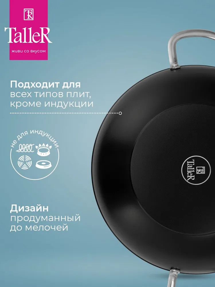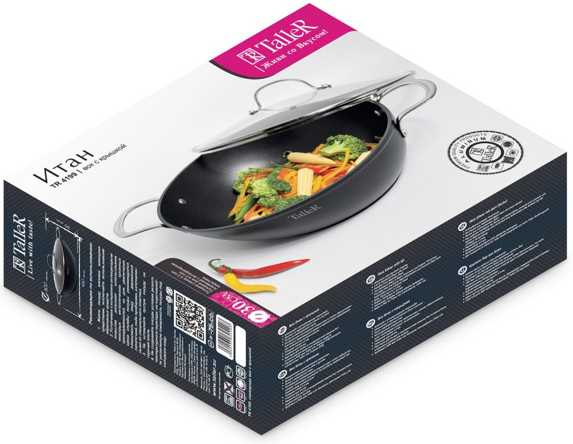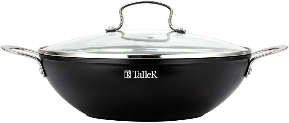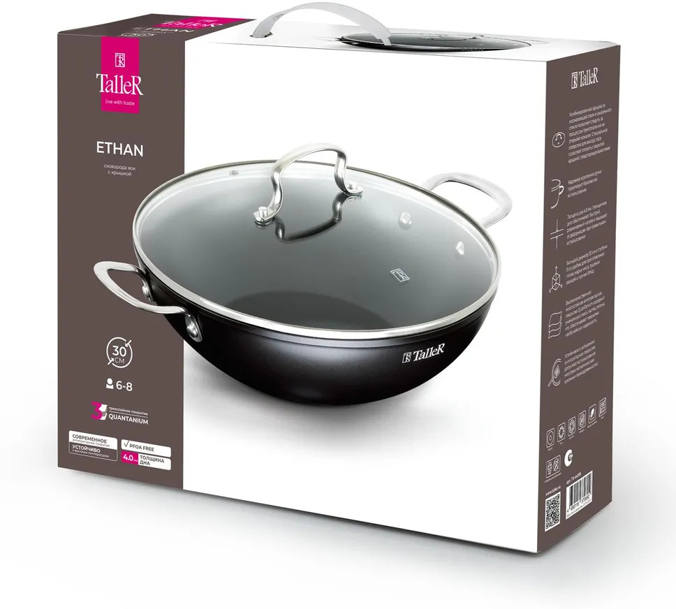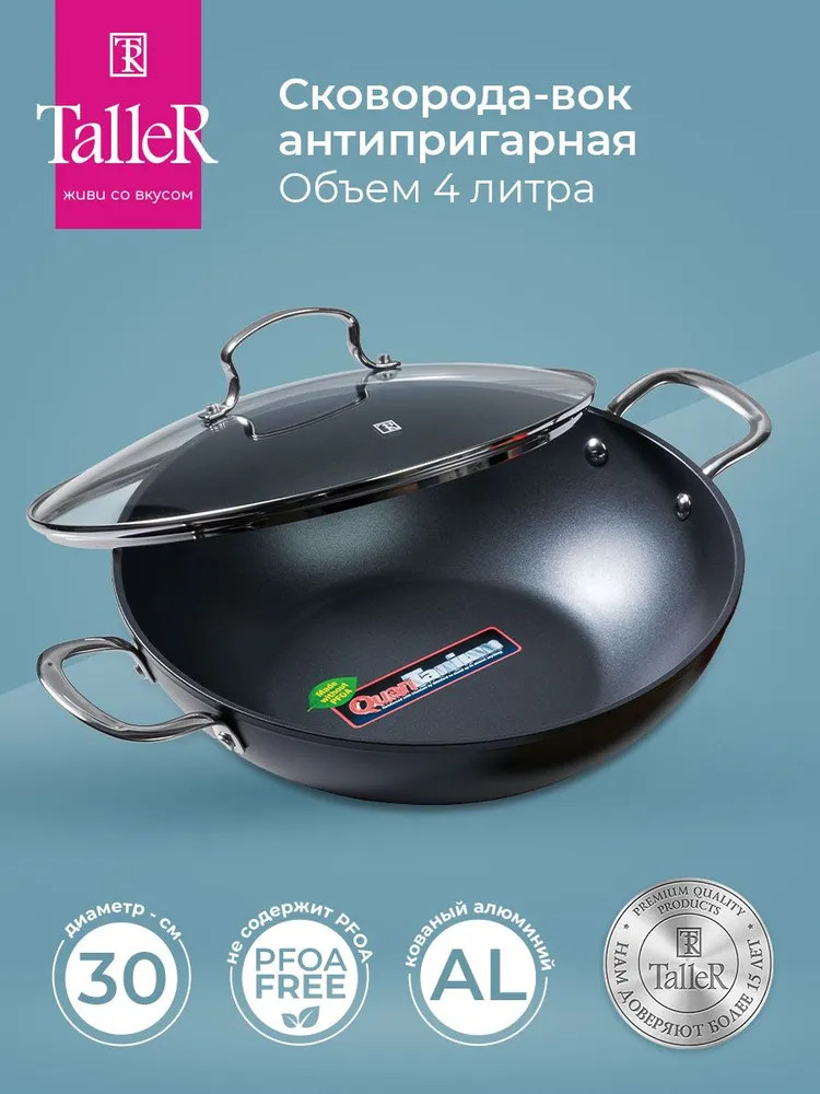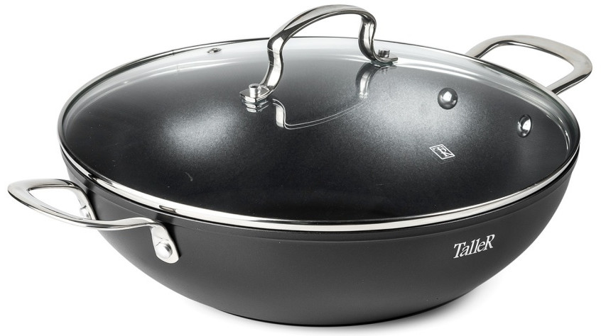 Сковорода-вок TalleR TR-44199 «Итан» 30 см с крышкой. Высота сковороды (без крышки) — 9 см. Высококачественное многослойное антипригарное покрытие Whitford QuanTanium® содержит уникальную смесь частиц титана, что обеспечивает покрытию необычайную стойкость к износу и царапинам, высокие антипригарные свойства этого покрытия позволяют готовить пищу с минимальным количеством масла. Антипригарное покрытие не содержит PFOA.