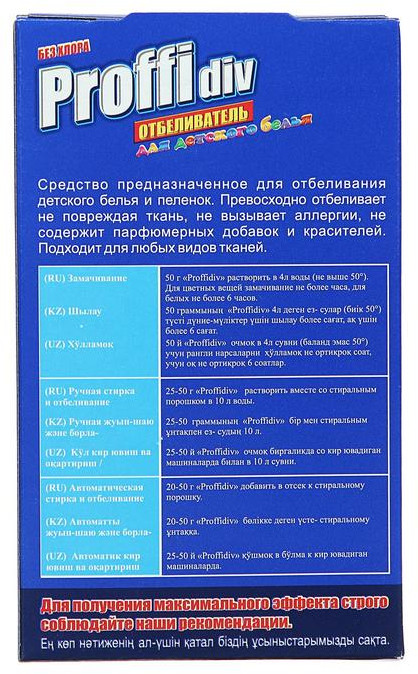 Proffidiv Отбеливатель для детского бельяВ данный момент этот товар отсутствует в продаже. Возможно, у нас найдется аналогичный или похожий товар здесь. Средство предназначено для выведения пятен с детского белья и пелёнок. Предназначен для разных видов пятен: от хорошо видимых, до самых маленьких. Не вызывает аллергии, не содержит парфюмерных добавок и красителей, подходит для любых видов тканей. |