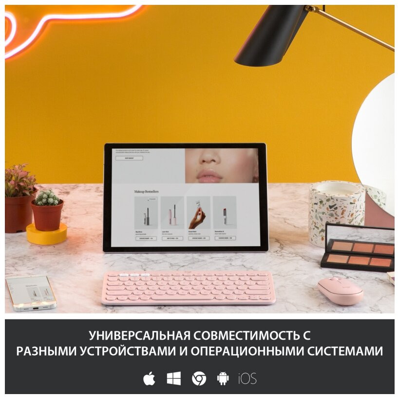 Все типы устройств и ОС. K380 Multi-Device подключается ко всем беспроводным устройствам Bluetooth с поддержкой внешних клавиатур и благодаря этому совместима с ОС Windows