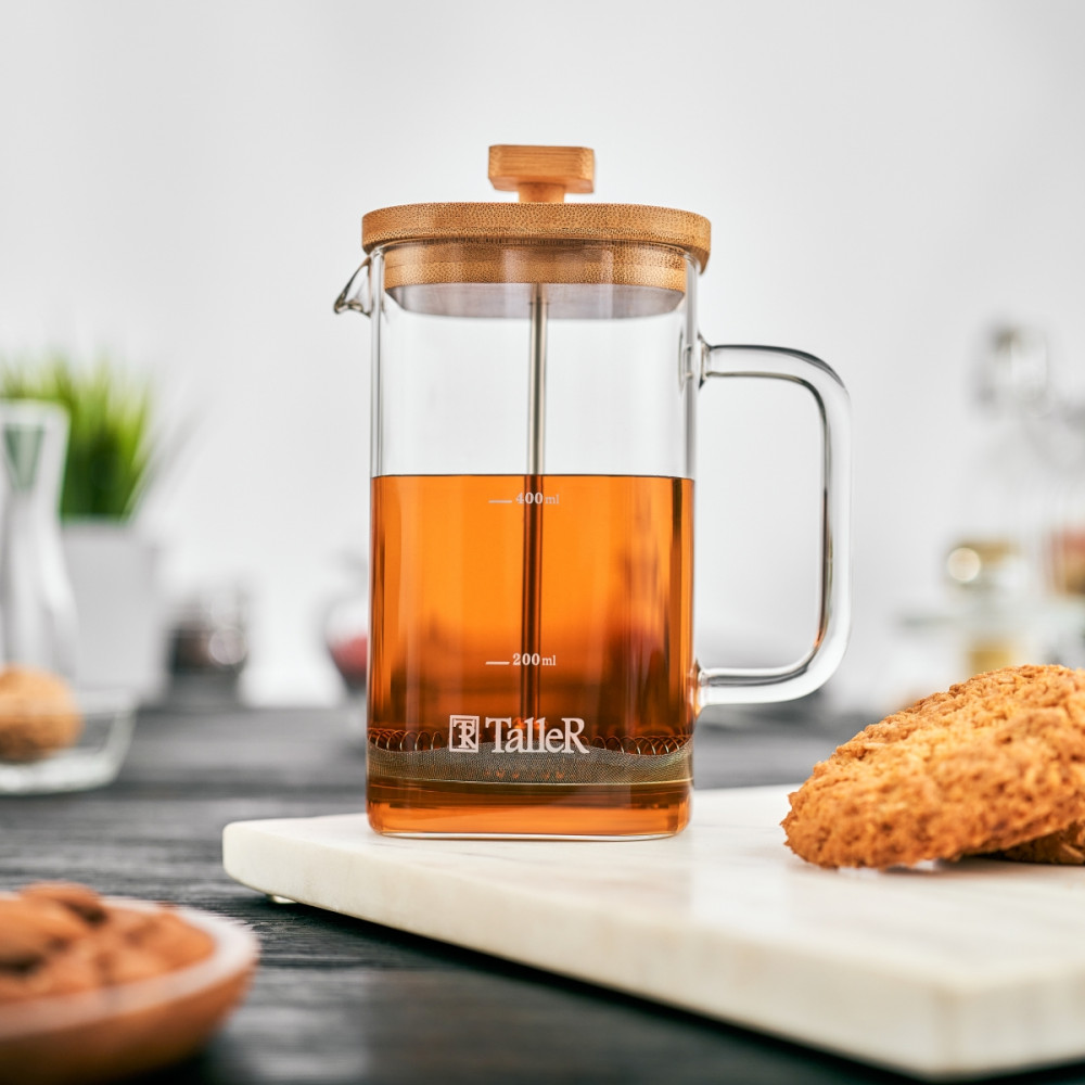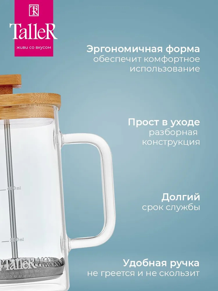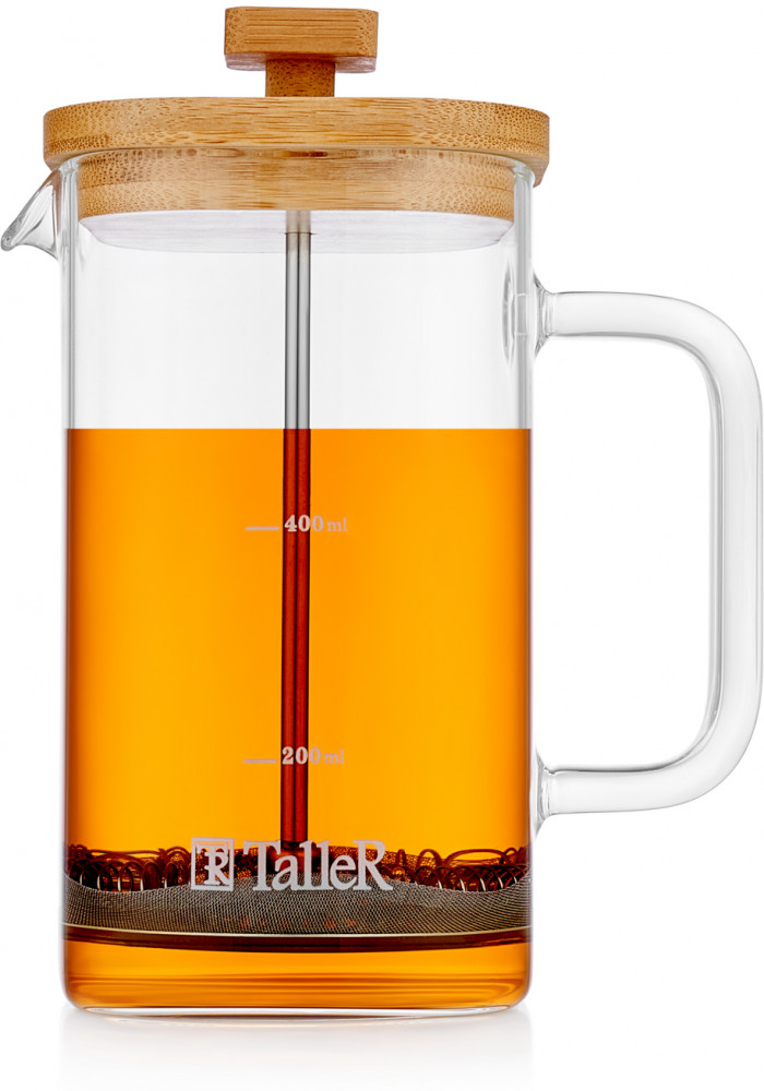Колба выполнена из боросиликатного стекла, устойчивого к перепадам температур. Удобная ненагревающаяся ручка. Корпус выполнен из высококачественной нержавеющей стали 18/10 (AISI 304) и безопасного пищевого пластика (РР). Пресс выполнен из высококачественной нержавеющей стали. Разборная конструкция пресс-фильтра облегчает уход за изделием.