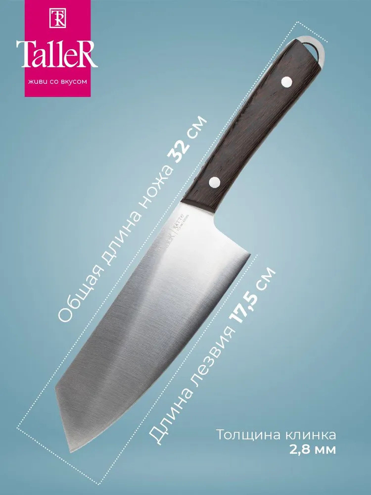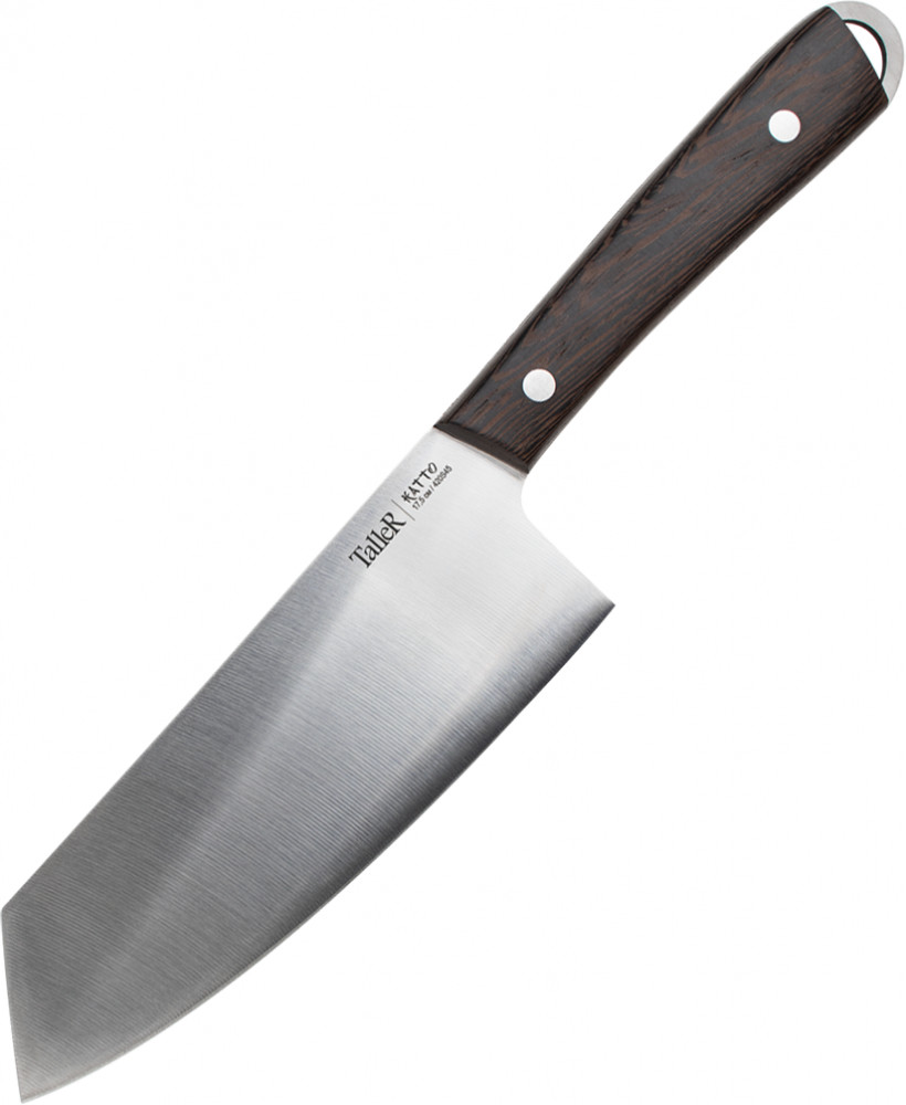 TalleR Топорик кухонный «Катто»В данный момент этот товар отсутствует в продаже. Возможно, у нас найдется аналогичный или похожий товар здесь. Подходит для разделки крупных кусков мяса или рыбы. Длина лезвия — 17,5 см, ширина лезвия — 5,9 см, толщина лезвия — 2,8 мм. Лезвие ножа сделано из высококачественной нержавеющей стали AISI 420S45. Ручка выполнена из нержавеющей стали и дерева венге. Есть отверстие для подвешивания. Используйте для заточки точилки TalleR или аналогичные (или точильные камни, мусаты). Рекомендуется ручная мойка. |
