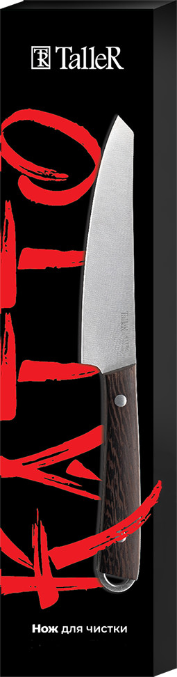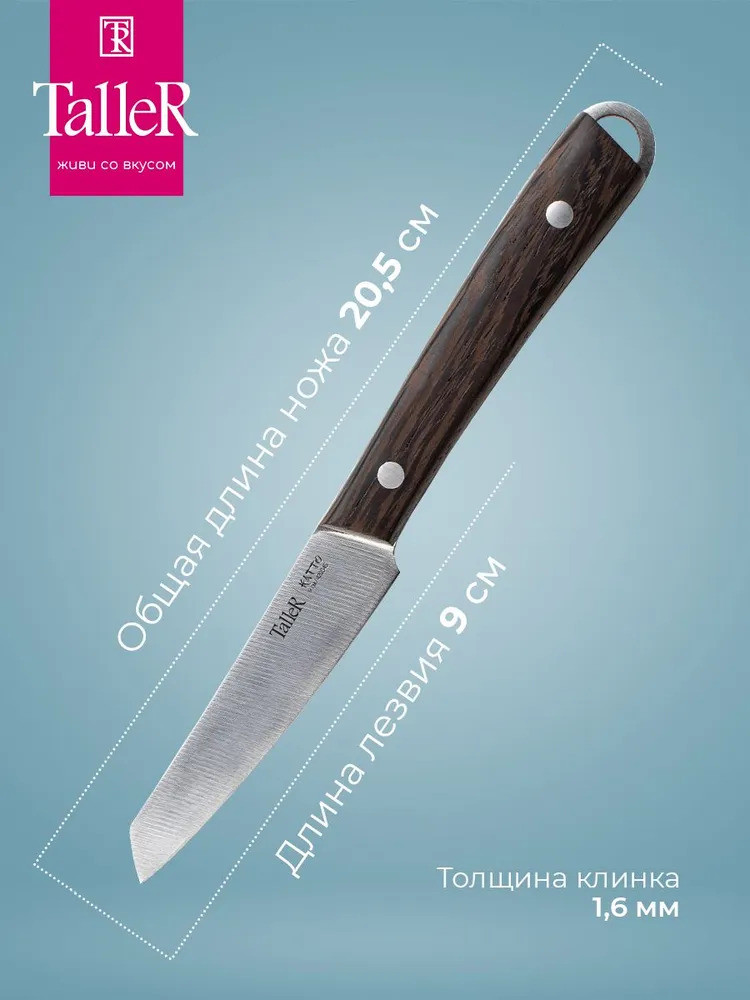 Подходит для очистки, нарезки фруктов и овощей и других целей. Лезвие ножа сделано из высококачественной нержавеющей стали AISI 420S45. Ручка выполнена из нержавеющей стали и дерева венге. Есть отверстие для подвешивания.