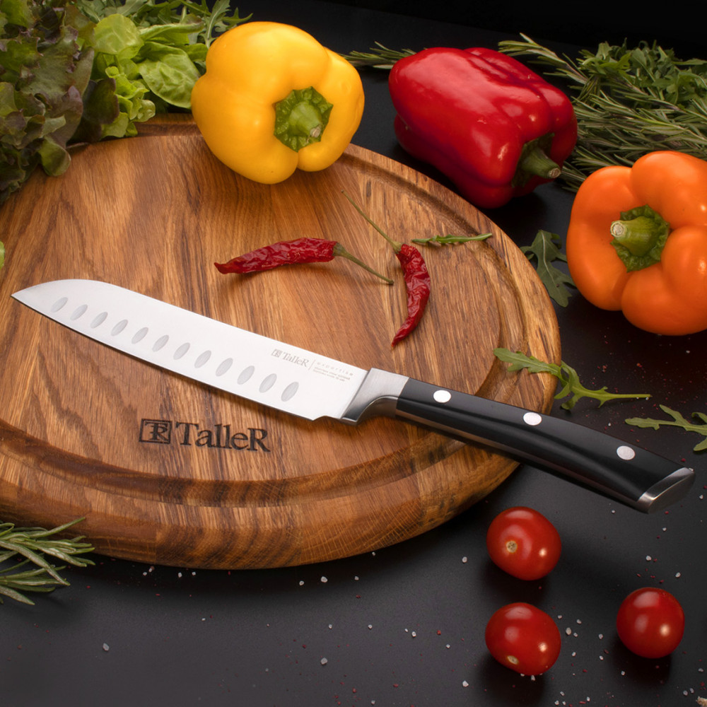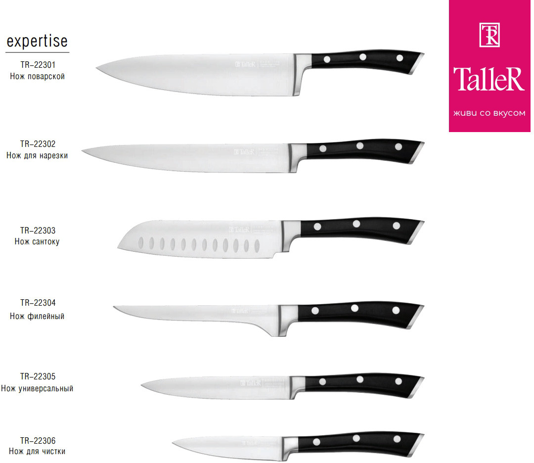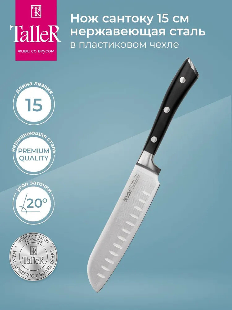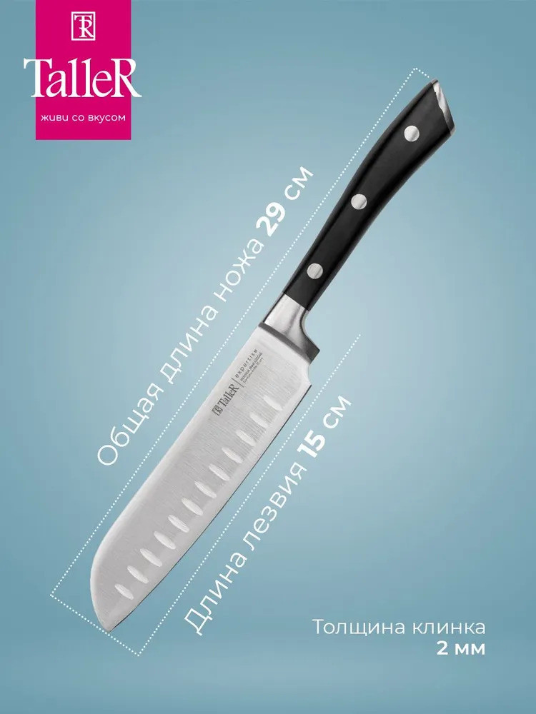 TalleR Нож сантокуВ данный момент этот товар отсутствует в продаже. Возможно, у нас найдется аналогичный или похожий товар здесь. Серия: Expertise Нож сантоку TalleR TR-22303 Expertise универсален в использовании. Подходит для нарезки мяса, рыбы и овощей. Лезвие ножей сделано из высококачественной нержавеющей стали AISI 420S45. Длина лезвия 15 см, ширина лезвия 3,5 см, толщина лезвия 2 мм. Ручка выполнена из ударопрочного пластика и нержавеющей стали.. Используйте для заточки точильные камни, мусаты, точилки. Рекомендуется ручная мойка. |
