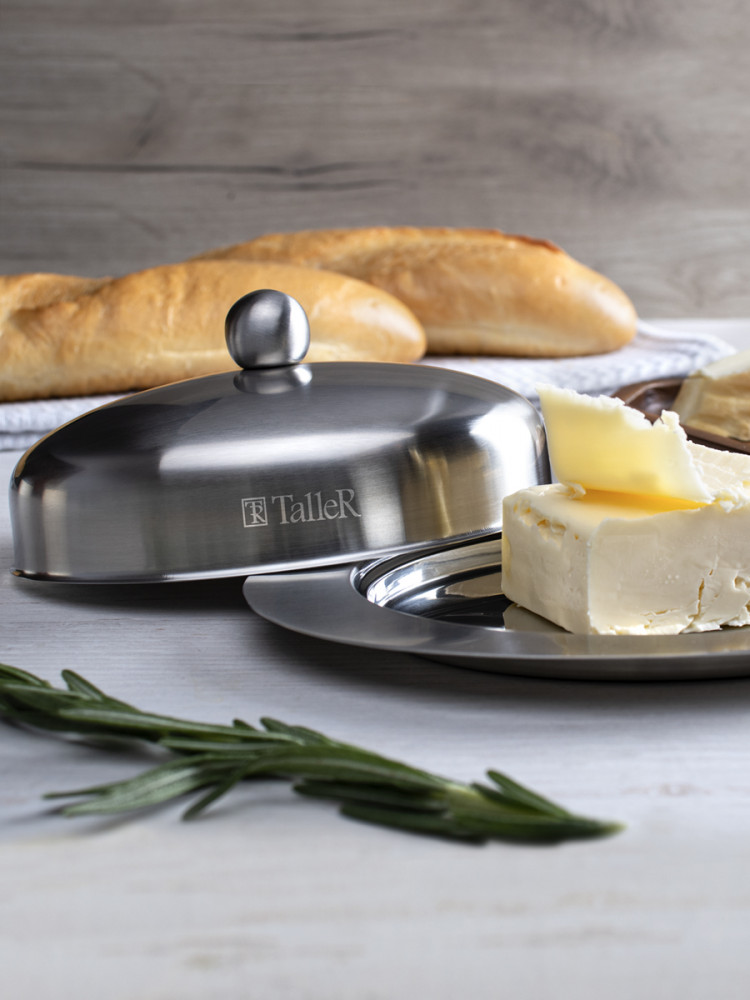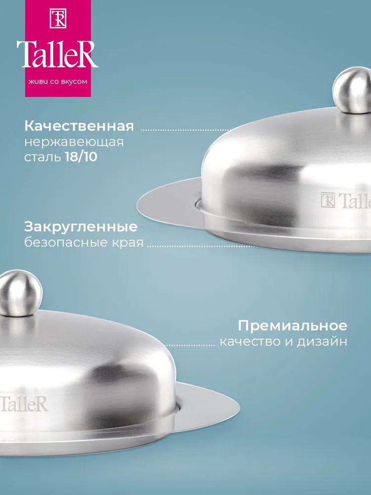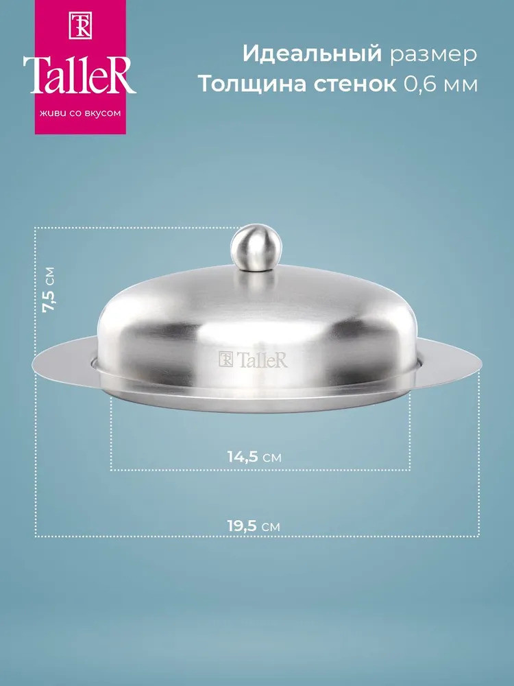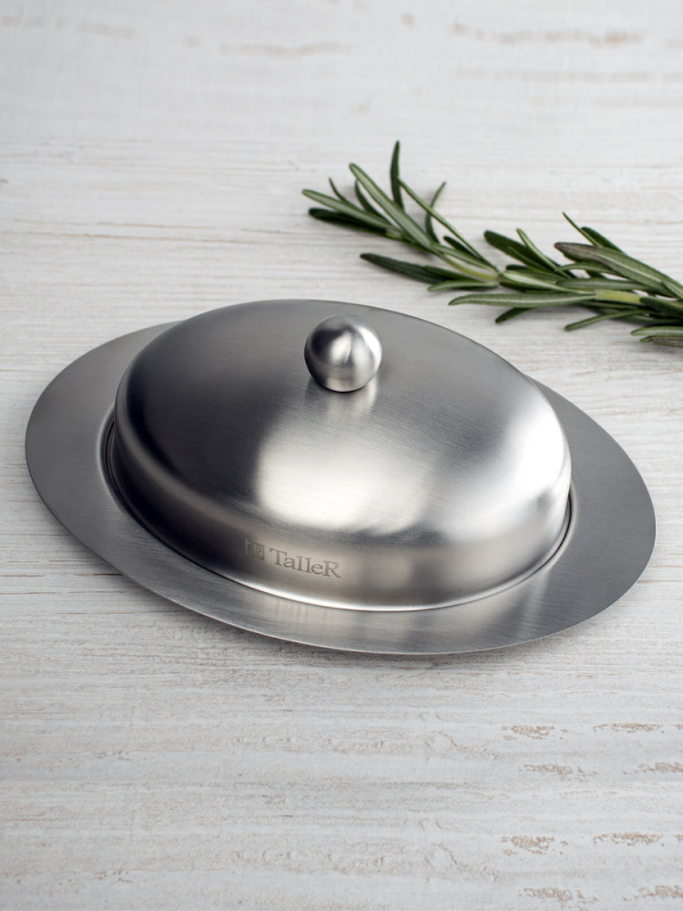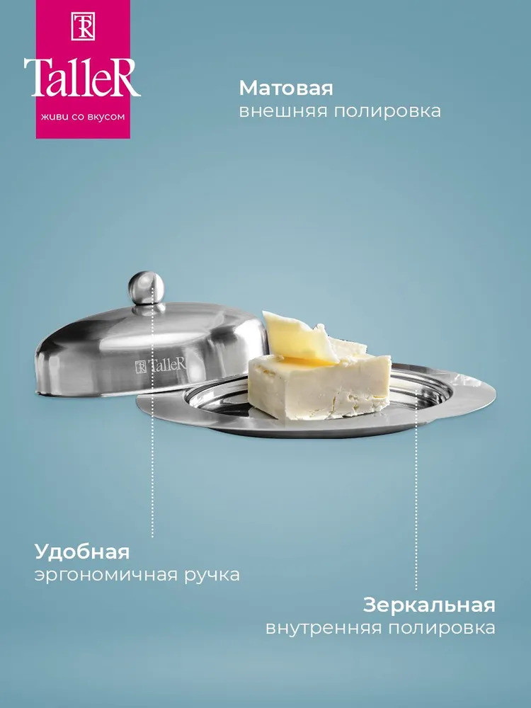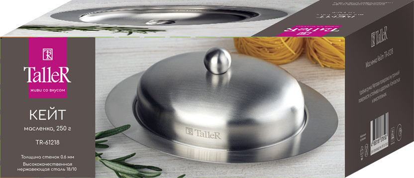 TalleR Масленка из нержавеющей стали «Кейт»В данный момент этот товар отсутствует в продаже. Возможно, у нас найдется аналогичный или похожий товар здесь. Масленка TalleR Кейт 250 г. Внешние размеры 19,5×13,5×7,5 см. Внутренние размеры: 14,5×10,5×4,5 см. Вмещает 250 г масла. Высококачественная нержавеющая сталь марки 18/10 (AISI 304). Толщина стенок 0,6 мм. Полировка внешняя — матовая, внутренняя — зеркальная. Удобная ручка. Закругленные безопасные края. Идеальная обработка края предметов и высокое качество полировки. Пригодна для мойки в посудомоечной машине без использования абразивных моющих средств. |