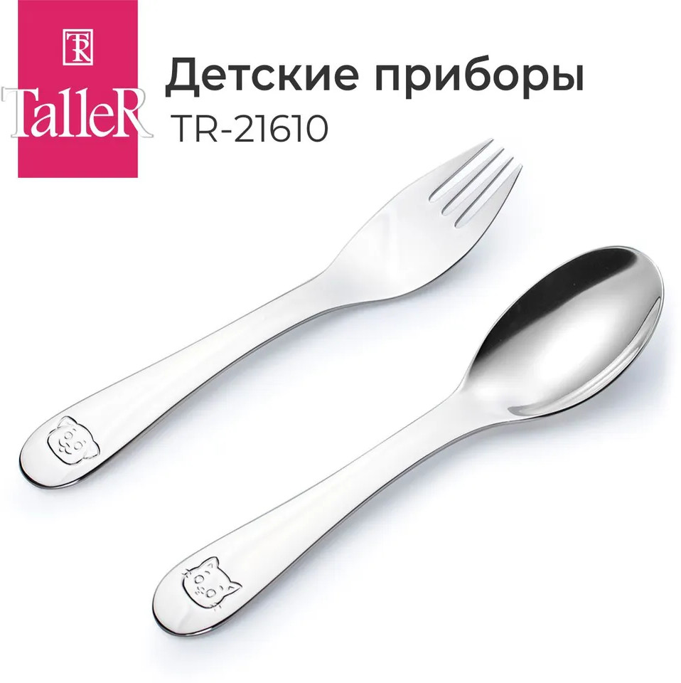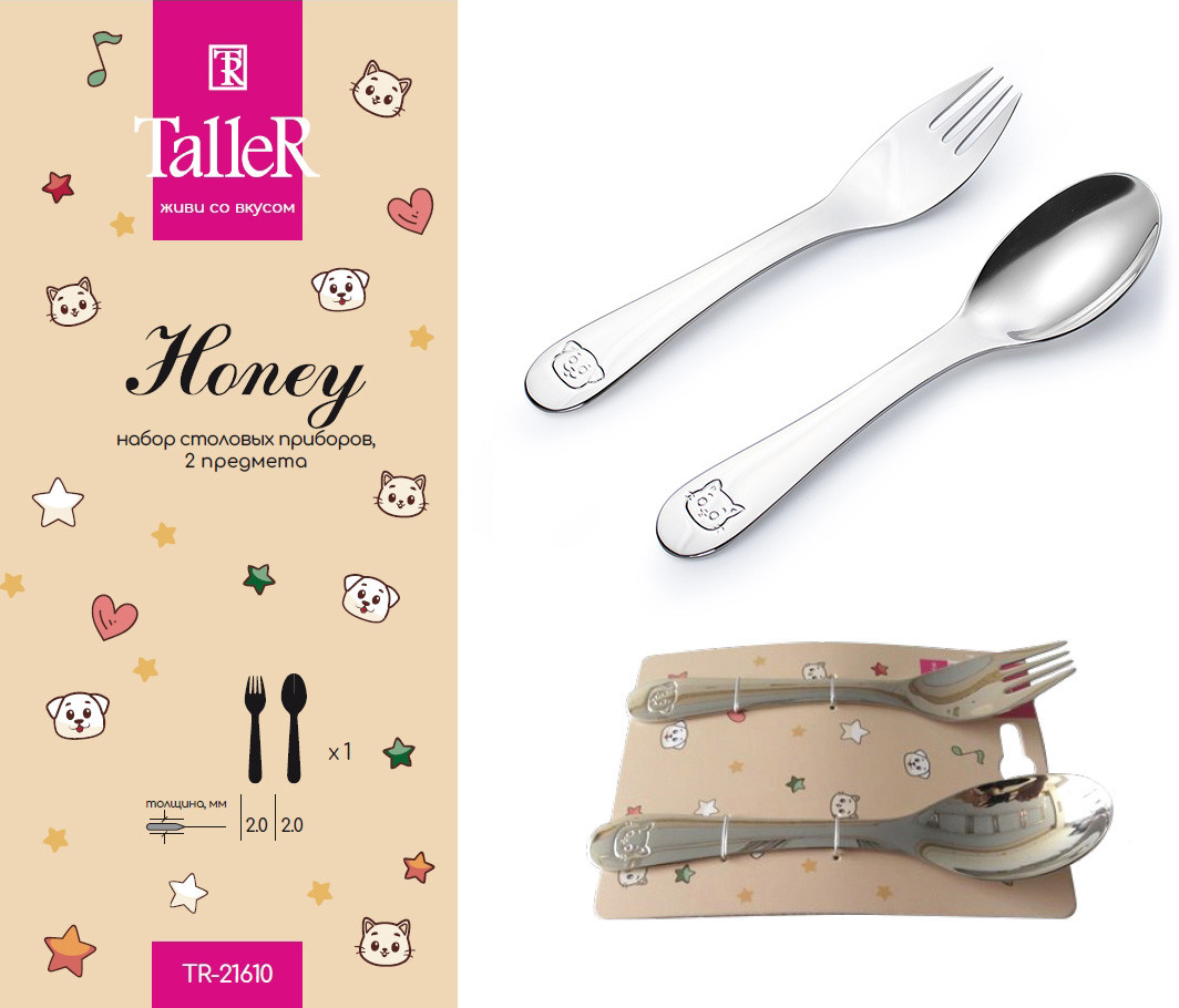 Приборы TalleR отличают идеальная обработка края и высокое качество полировки, толстый металл 2 мм, безопасная форма. Приборы украшены рельефными картинками, которые понравятся любому ребенку. Для детей от 3-х лет.