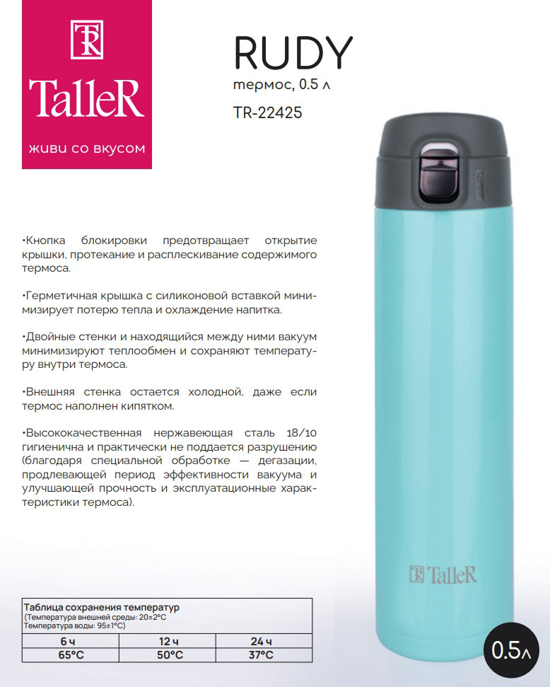 Сохранение температуры: 6 часов — 65°C, 12 часов — 50°C, 24 часа — 37°C. Для лучшего сохранения температуры прогрейте термос кипятком. Рекомендуется ручная мойка.