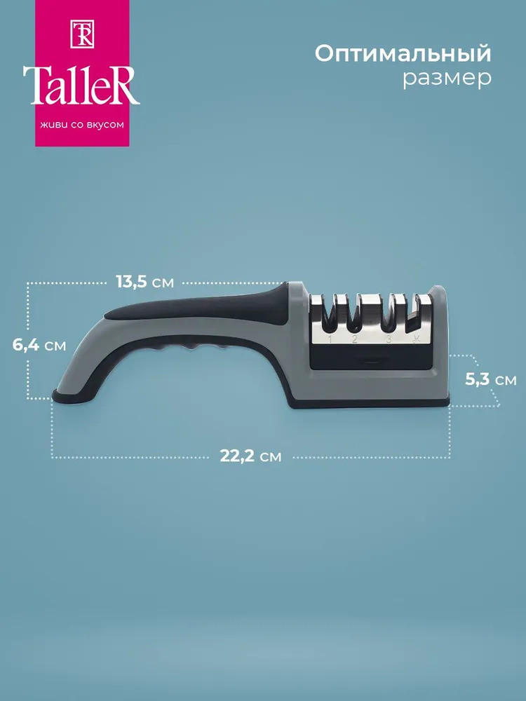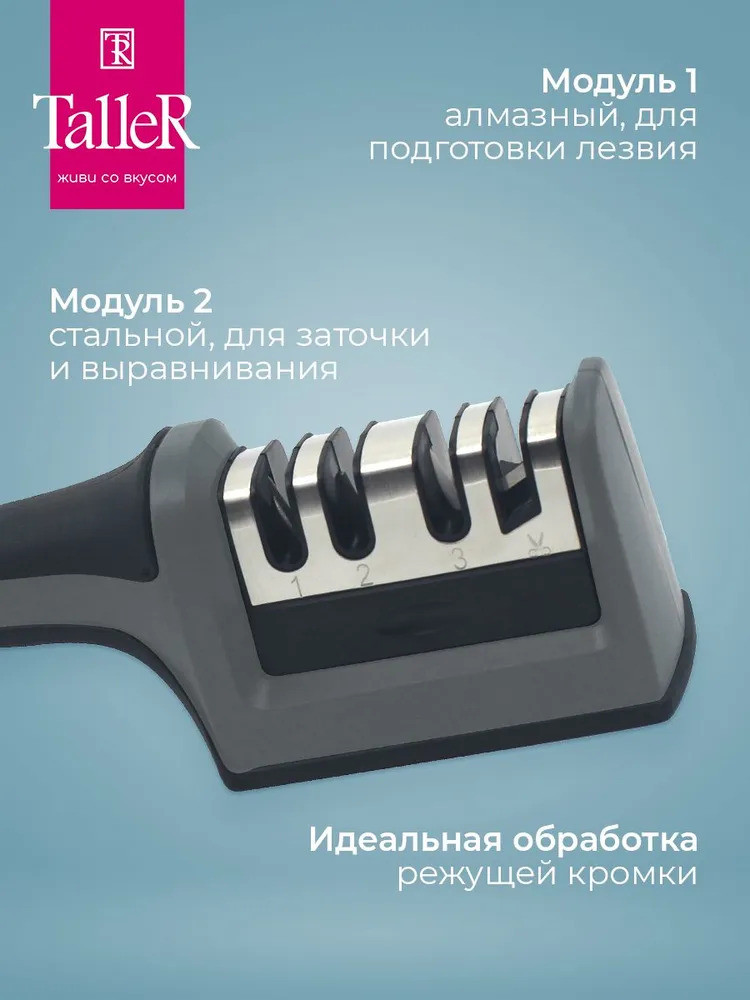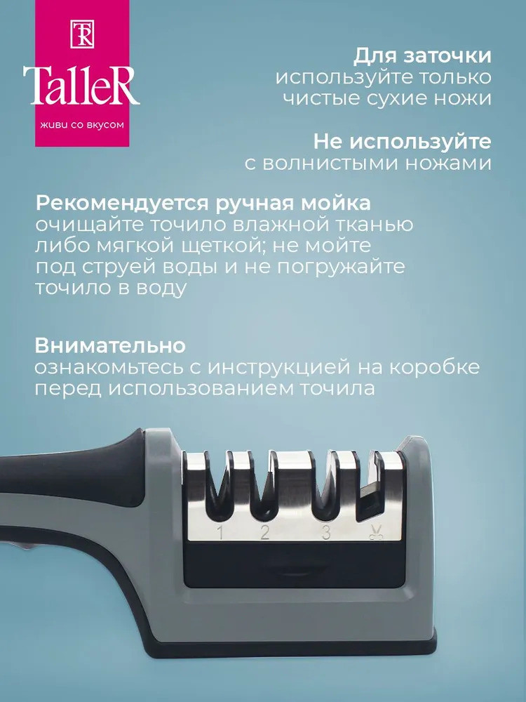 Для заточки используйте только чистые сухие ножи. Не используйте с волнистыми ножами. Рекомендуется ручная мойка (очищайте точило влажной тканью либо мягкой щеткой; не мойте под струей воды и не погружайте точило в воду). Внимательно ознакомьтесь с инструкцией на коробке перед использованием точила!