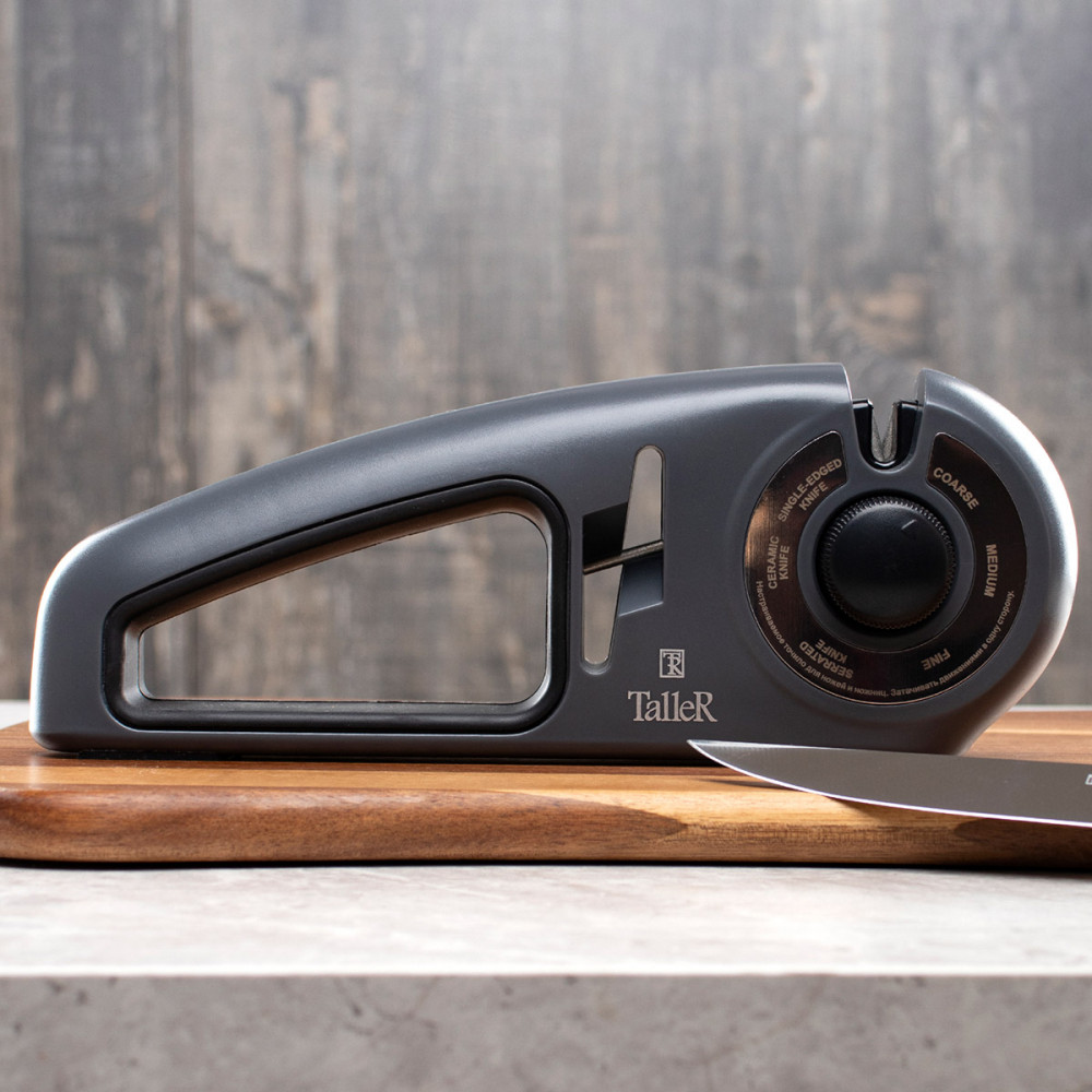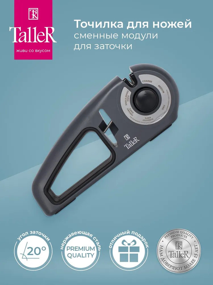 Подходит для всех кухонных ножей и для заточки ножниц. Сменяемые элементы для заточки различных типов ножей включая ножи с односторонней заточкой и ножи для нарезки хлеба. Корпус выполнен из пищевого пластика. Удобный переключатель модулей. Силиконовые противоскользящие протекторы. Комфортная ручка. Угол заточки — 20º.