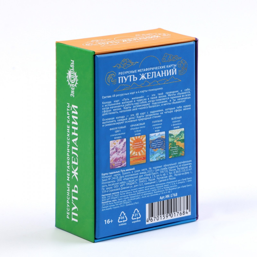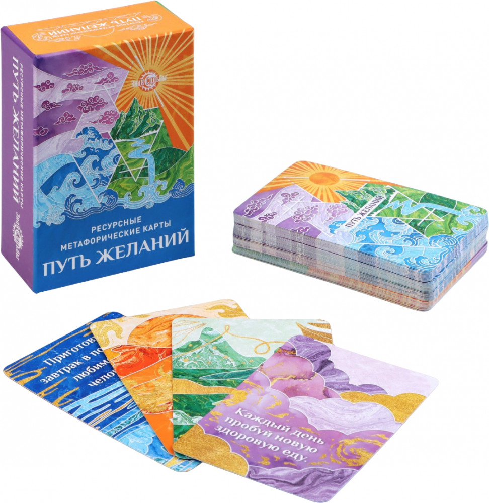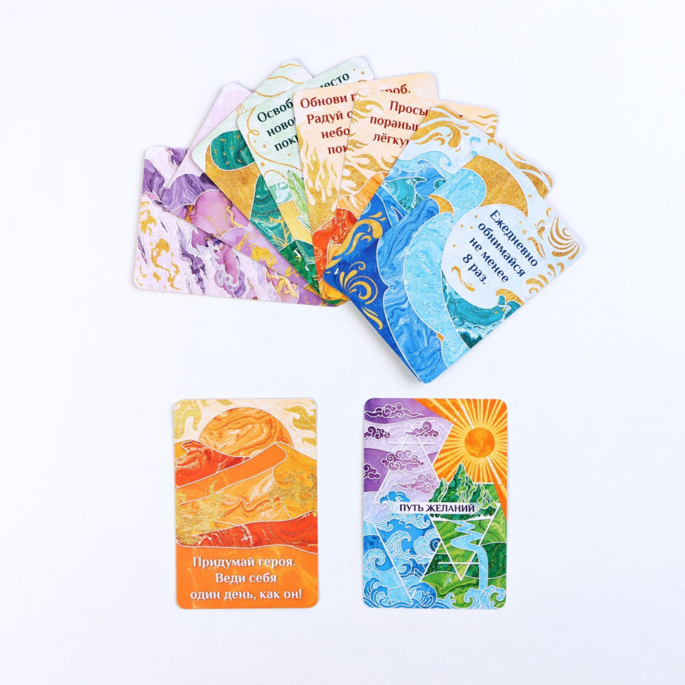 Колода карт «Путь желаний» — это ваш проводник к своему внутреннему миру, к исполнению желаний и чудесам в жизни. Эти карты универсальные и могут использоваться как гадальные карты, либо как терапевтические карты для мужчин и для женщин. Это простой и понятный инструмент психотерапии и самопознания. Магические карты можно приобрести в подарок, ведь данные подарочные карты подойдут всем, кто интересуется психологией и саморазвитием. Психологические метафорические карты станут хорошим подарком всем, кто увлекается оккультизмом, нумерологией, язычеством, астрологией и психологией. Карты активизируют подсознание и помогают наполнить «колесо баланса»! Когда начинается работа над собой, когда царит гармония во всех сферах жизни, мечты начинают сбываться. Карты разделены на четыре сферы жизни, символизирующие основные природные стихии.
