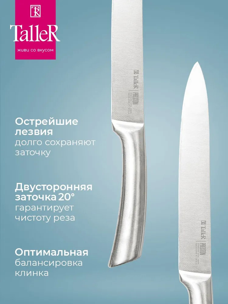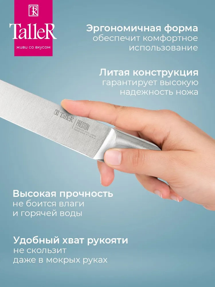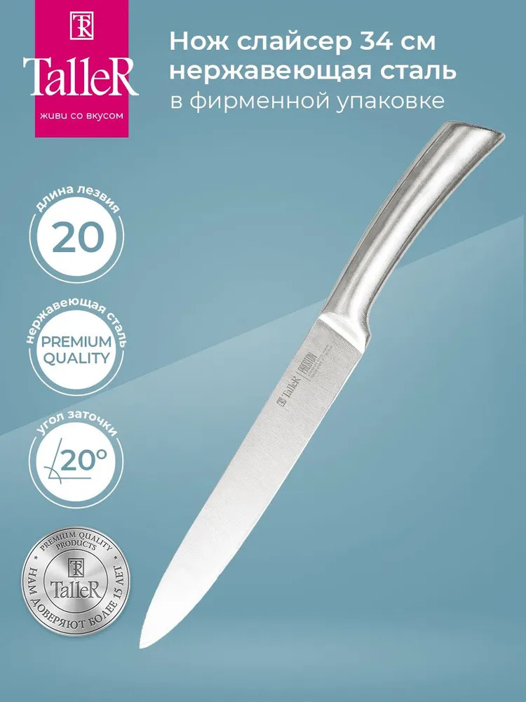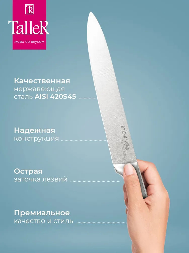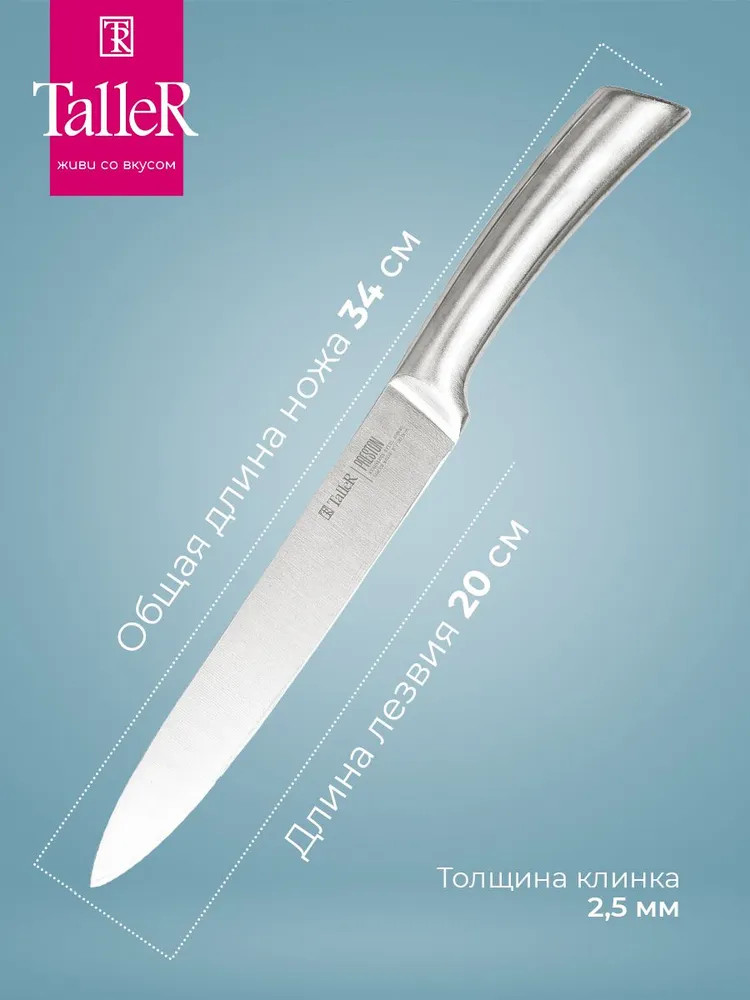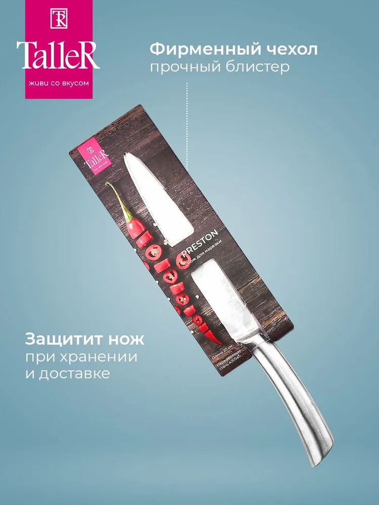 TalleR Нож для нарезки «Престон»В данный момент этот товар отсутствует в продаже. Возможно, у нас найдется аналогичный или похожий товар здесь. Подходит для нарезки овощей, фруктов и зелени, сырого и вареного мяса, разделки курицы и рыбы. Им легко нарезать арбуз, дыню. Толщина лезвия — 2,5 мм. Лезвие ножей сделано из высококачественной коррозионностойкой стали AISI 420S45. Ручка выполнена из нержавеющей стали. |
