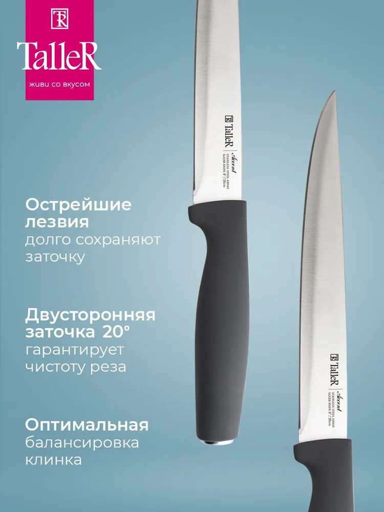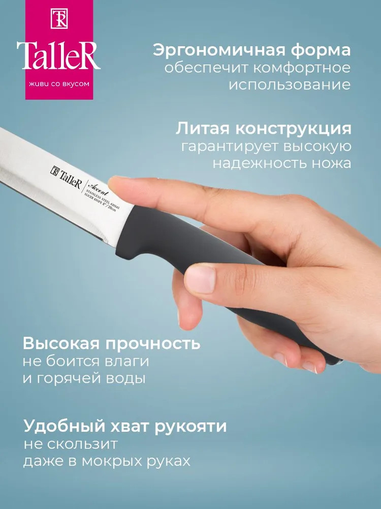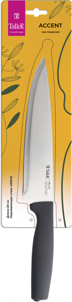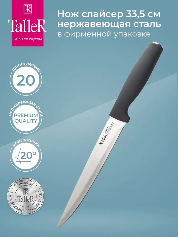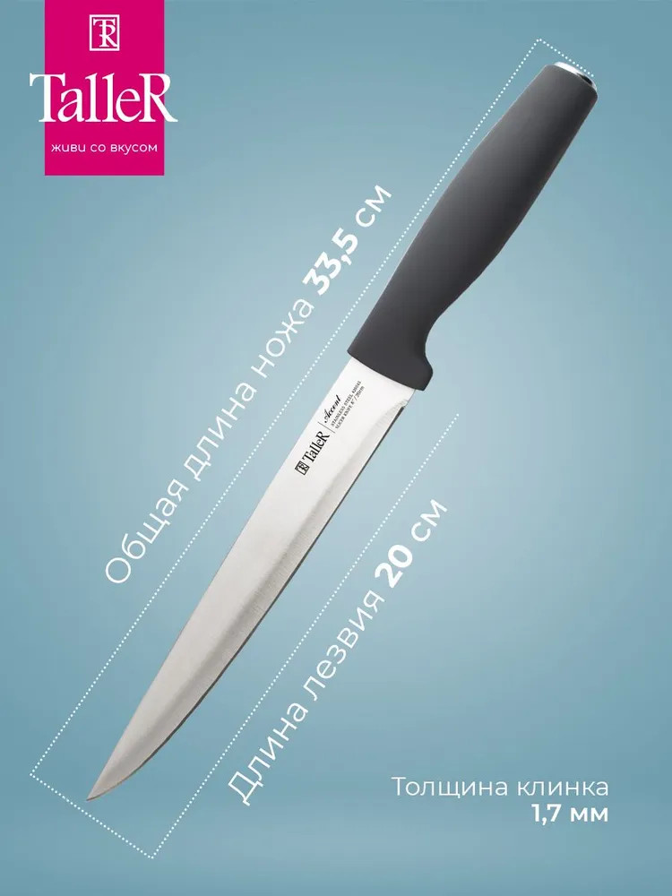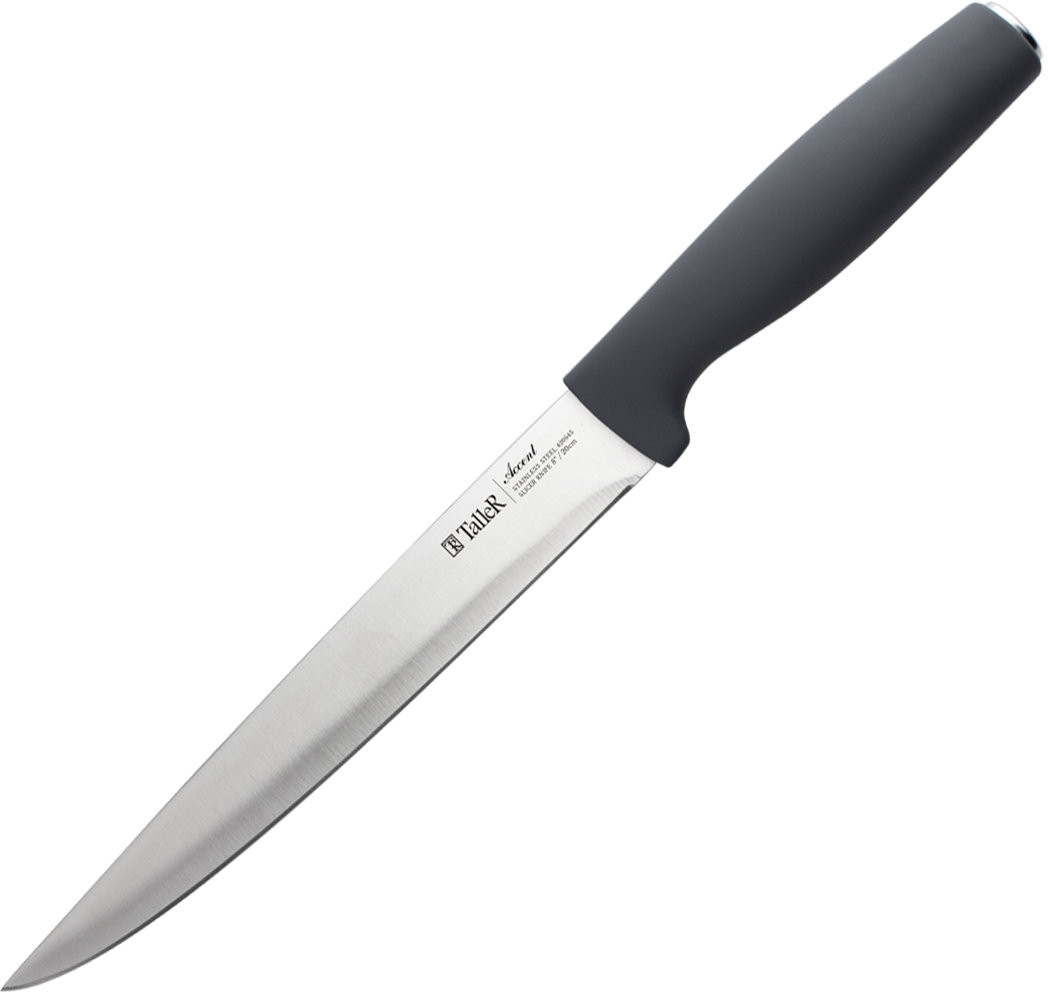 TalleR Нож для нарезкиВ данный момент этот товар отсутствует в продаже. Возможно, у нас найдется аналогичный или похожий товар здесь. Подходит для нарезки овощей, фруктов и зелени, сырого и вареного мяса, разделки курицы и рыбы. Им легко нарезать арбуз, дыню. Длина лезвия — 20 см. Толщина лезвия — 1,7 мм. Лезвие ножа сделано из высококачественной нержавеющей стали AISI 420S45. Ручка выполнена из ударопрочного пластика с приятным на ощупь покрытием soft-touch. |