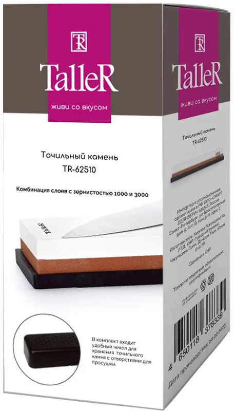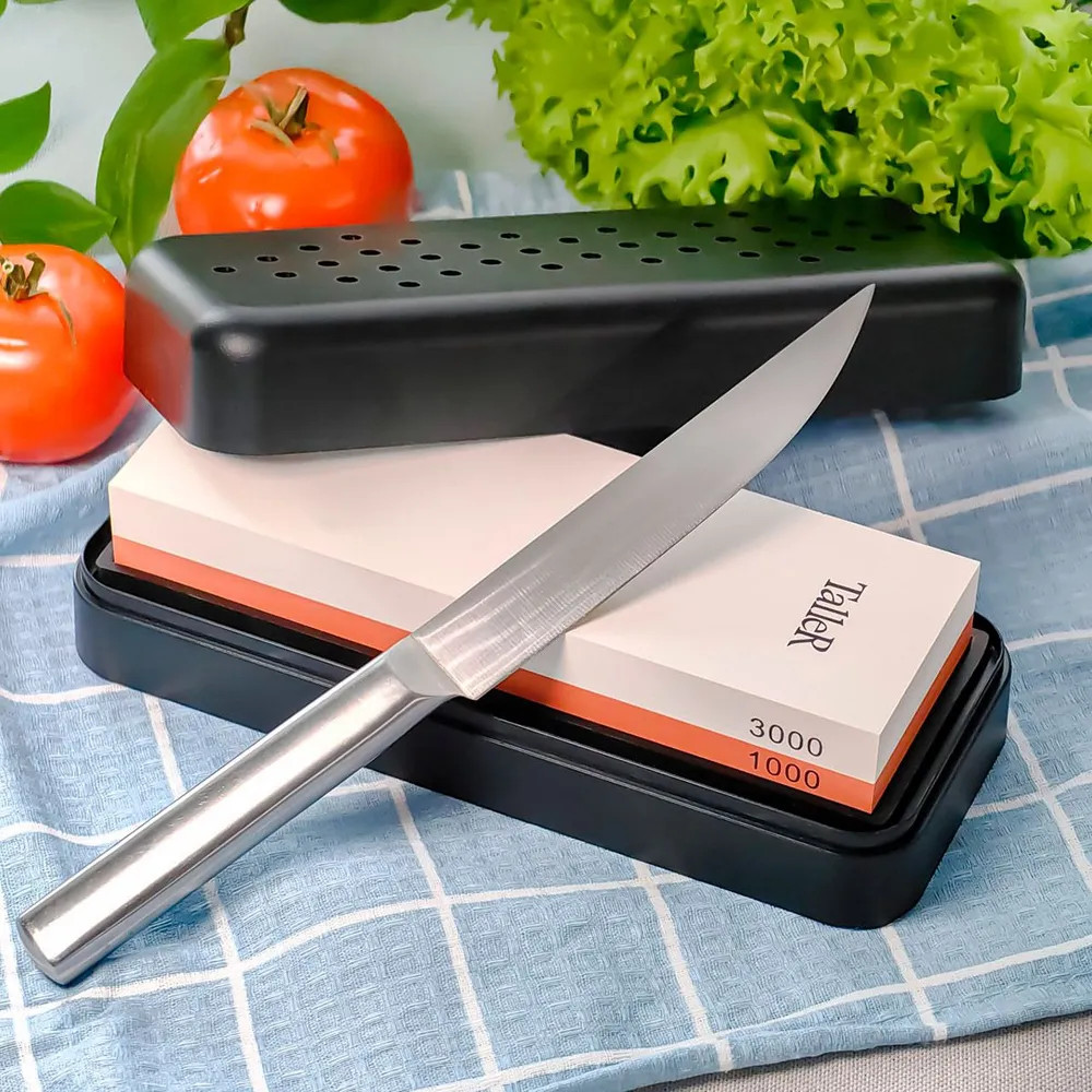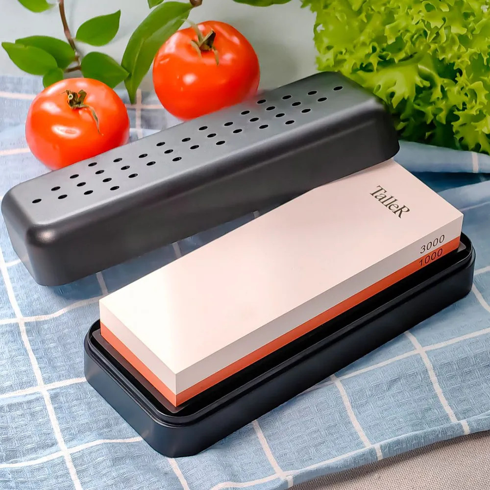Точильные стороны отличаются цветом и отметками о зернистости для удобства использования. Съемная силиконовая подставка предотвращает скольжение точильного камня и повреждение поверхности стола. Удобный пластиковый чехол для хранения с отверстиями для просушки точильного камня.