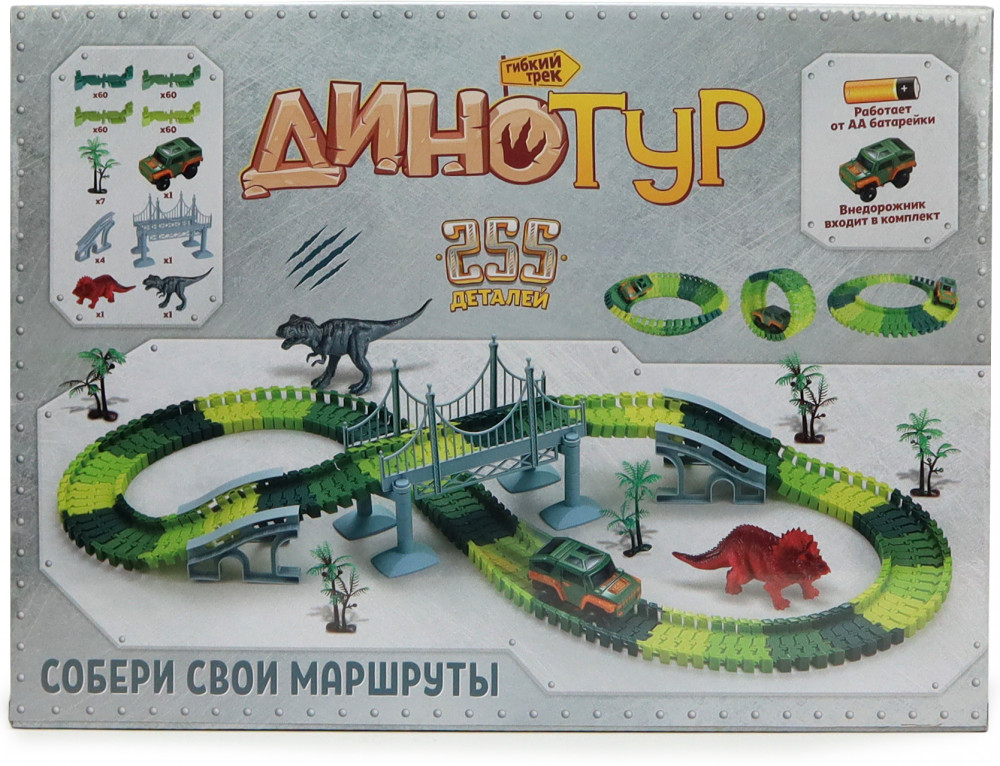 💳 Оплатить за товар можно при получении 🇰🇿 Есть бесплатная доставка по Казахстану 🎁 Копите бонусы с каждой покупки Серия: Динозавры Гибкий автотрек — это новый тренд в направлении игровых трасс и игр с машинками. Трассу можно собирать разными способами, не только для того, чтобы она меняла направление в разные стороны и поворачивала, благодаря специальным рельсам, а также ее можно сделать выпуклой или вогнутой в виде кольца, заставив машинку ездить внутри по кругу. В серии гибких автотреков «Дино Тур» — трасса яркого зеленого цвета, в набор входит джип, фигруки динозавров и природные объекты, при помощи которых можно моделировать захватывающие игровые сюжеты как в кино «Мир Юрского Периода»!. Для строительства интересных участков трассы в комплект также входит подвесной мост — всего в наборе 255 деталей. Набор предназначен для детей старше 3-х лет. Содержит мелкие детали. Работает от одного элементов питания типа АА, который не входит в комплект. |