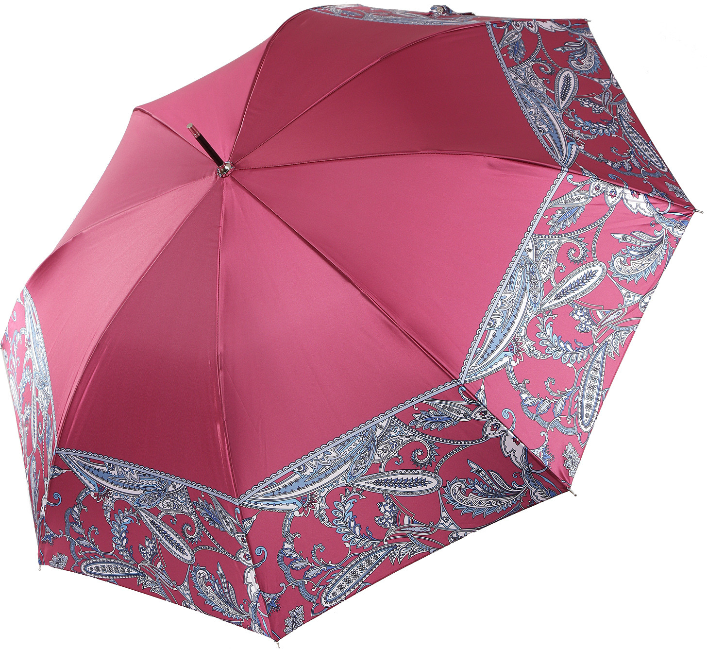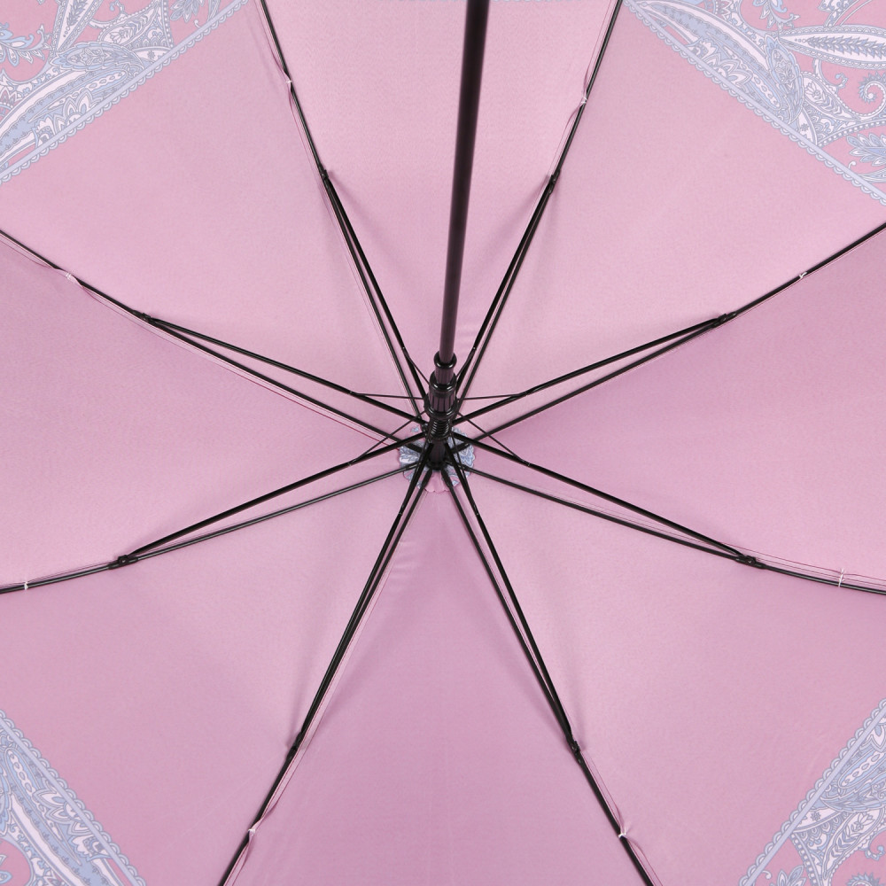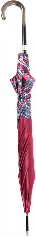 Купол зонта-трости в красном оттенке украшен широким кантом в виде орнамента «пейсли». Рисунок нанесен с помощью панорамной техники цифровой печати, которая обеспечивает долговечность изображению и точность цветопередачи. Купол выполнен из прочного водоотталкивающего полиэстера (сатин) и обладает гладкой шелковистой текстурой. Вода, попадая на такой купол, превращается в капли и легко скатываться вниз.