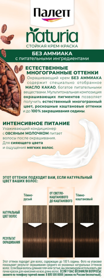 Окрашивающий крем: Aqua, Cetearyl Alcohol, Ethanolamine, Glyceryl Stearate SE, Toluene-2,5-Diamine Sulfate, Ceteareth-20, Octyldodecanol, Sodium Laureth Sulfate, Resorcinol, Sodium Cetearyl Sulfate, Parfum, Serine, Oleic Acid, Glycerin, Sodium Sulfite, Theobroma Cacao Seed Butter, 2-Amino-3-Hydroxypyridine, Etidronic Acid, Carbomer, m-Aminophenol, 2-Methylresorcinol, Potassium Hydroxide, Ascorbic Acid, Limonene, Propylene Glycol, Sodium Sulfate, Linalool, Hexyl Cinnamal, Benzyl Alcohol, Benzoic Acid.