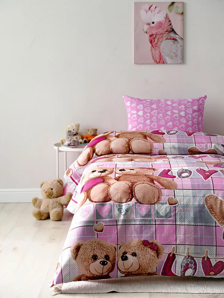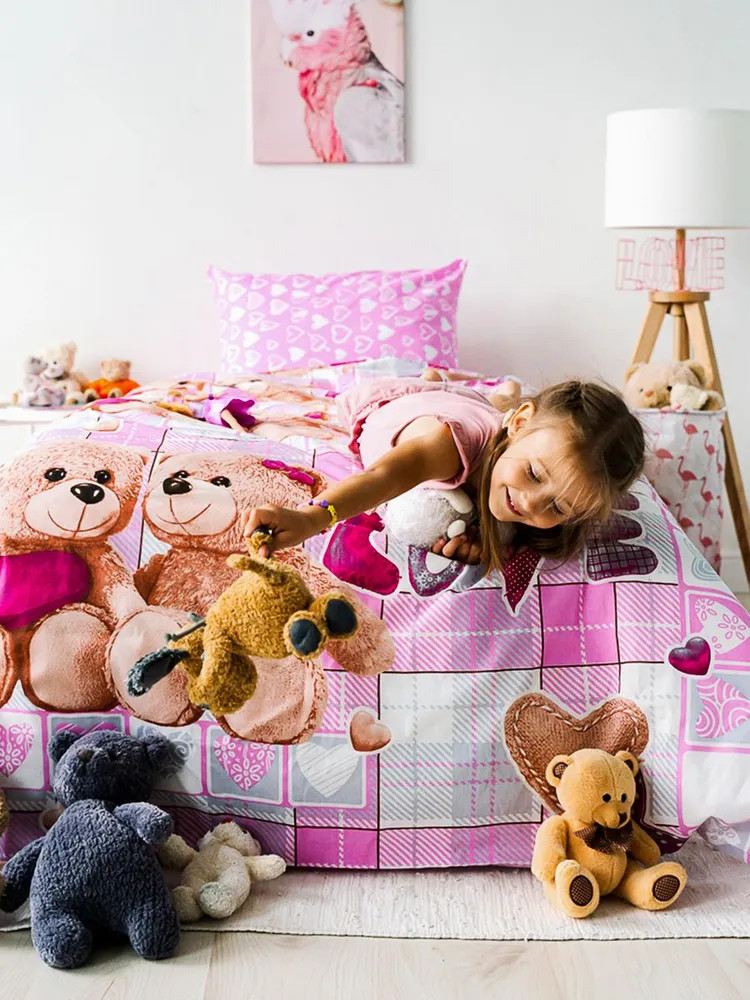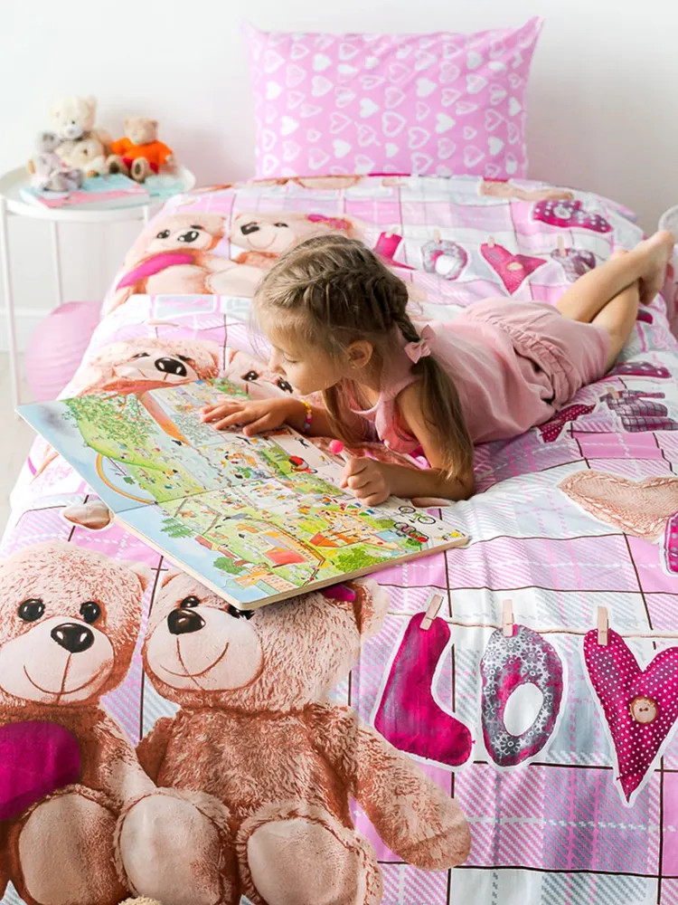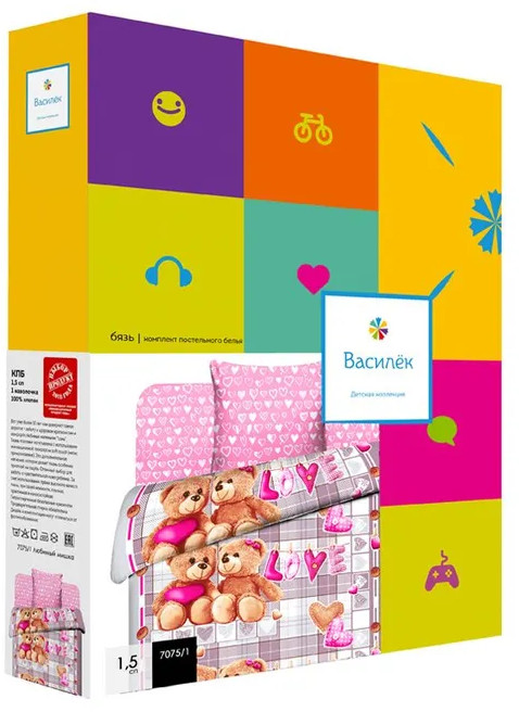 Детский комплект постельного белья изготовлен из ткани бязь, один из наиболее популярных вариантов исполнения постельного белья. Состав бязи — 100% хлопок. В состав ткани входят гипоаллергенные красители, легко стирается, гладится и долго сохраняет цвет и прочность при многочисленных стирках. Преимуществом постельного белья из бязи является его долговечность, совмещенная со сравнительно невысокой стоимостью.