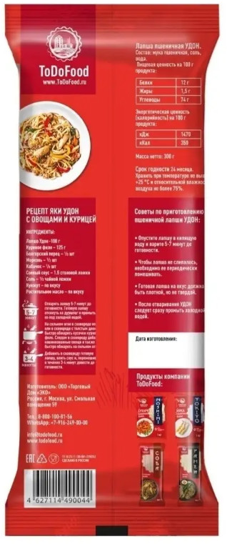 ToDoFood Лапша пшеничная «Удон»В данный момент этот товар отсутствует в продаже. Возможно, у нас найдется аналогичный или похожий товар здесь. В азиатской кухне удон считается универсальным продуктом. Его едят в горячем и холодном виде. Наиболее часто он подается как суп с добавлением соевого соуса. Еще лапша идет как гарнир к мясу, морепродуктам, комбинируется с овощным миксом, как лапша вок. Лапша очень популярна из за своей простоты приготовления. Удон варится очень быстро — за 5 минут в кипятке. После отваривания промывается по типу обычных макарон и заправляется бульоном или добавляется к основным блюдам. |