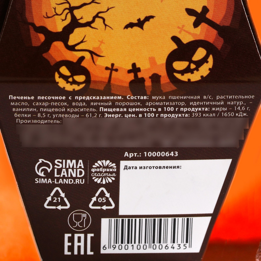 💳 Оплатить за товар можно при получении 🇰🇿 Есть бесплатная доставка по Казахстану от 1 дня 🎁 Копите бонусы с каждой покупки Серия: Хэллоуин Это печенье представляет собой небольшое хрустящее лакомство, в котором запечен листочек с предсказанием. Печенье может стать не только вкусным десертом, но и отличным вариантом подарка близкому человеку. Он обязательно оценит неординарный подход, а оригинальная надпись-сюрприз оставит после себя массу положительных эмоций! Страшно-красивая подарочная упаковка печенек порадует каждого, а также станет отличным подарком в этот праздник! |