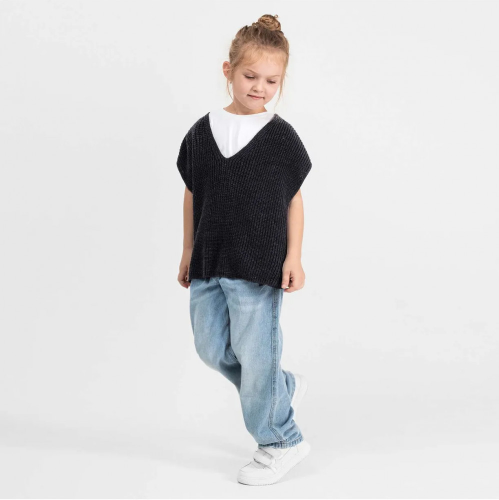 Красивый цвет как раз под школьную форму, крупная вязка, жилет толстенький теплый. Есть одно НО детский размер 152 примерно на взрослый 52 XL)))Да, это оверсайз указан, но пройма для головы размером с детские плечи.