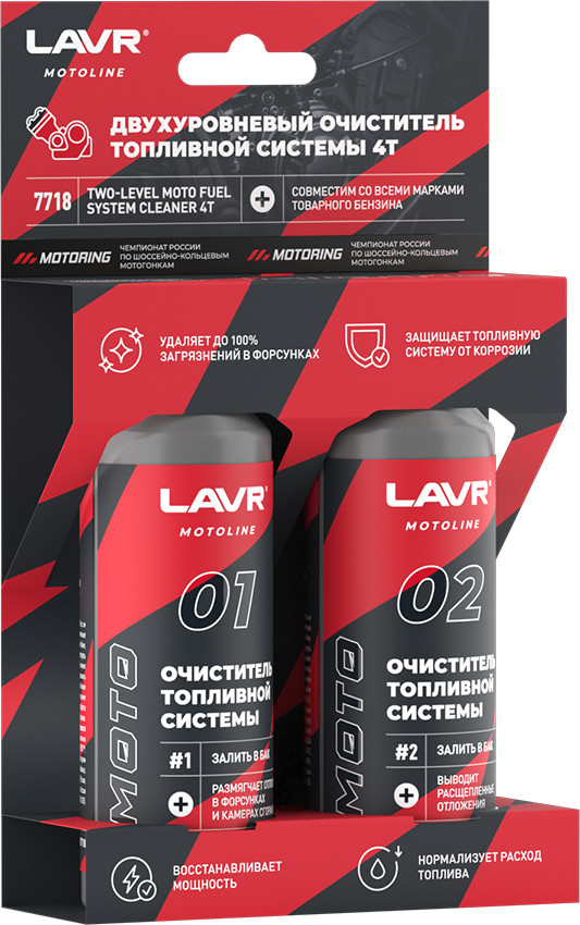 Способ применения: рекомендуется проводить двухуровневую очистку топливной системы каждые 3 — 5 тыс. км пробега. Каждый из компонентов рассчитан на объем бензина 15-18 л. Допустимо незначительное увеличение концентрации состава в топливе. В случаях, если топливный бак имеет меньший объем, использование каждого из компонентов необходимо разделить на два этапа. Перед применением прогреть составы до комнатной температуры и встряхнуть. Залить состав № 1 в бак перед заправкой в момент включения индикации низкого уровня топлива. Для лучшего смешивания составов с бензином не заливать их в момент высокого уровня топлива. Израсходовать бензин до включения индикатора «низкий уровень топлива». Рекомендуется эксплуатировать мотоцикл в режиме средних оборотов. Повторить процедуру с составом № 2.