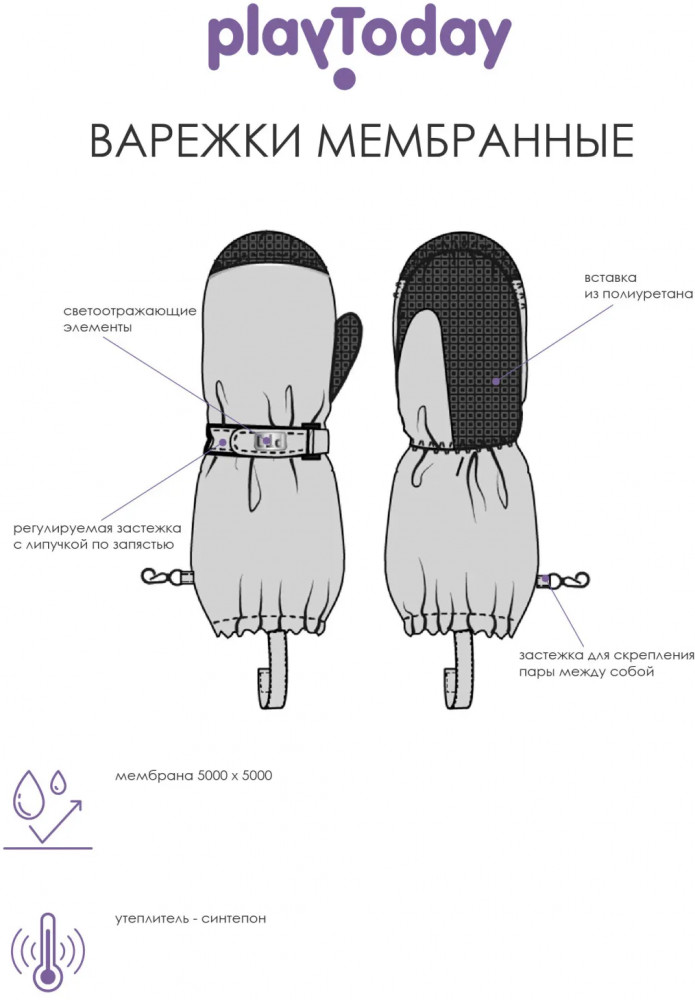 Зимние варежки-краги с мембраной. Утеплитель — синтепон. Мягкая ладошка из влагостойкого полиуретана. Регулируемая застёжка с липучкой по запястью. Застежка для скрепления пары между собой. Варежки со светоотражающими элементами.