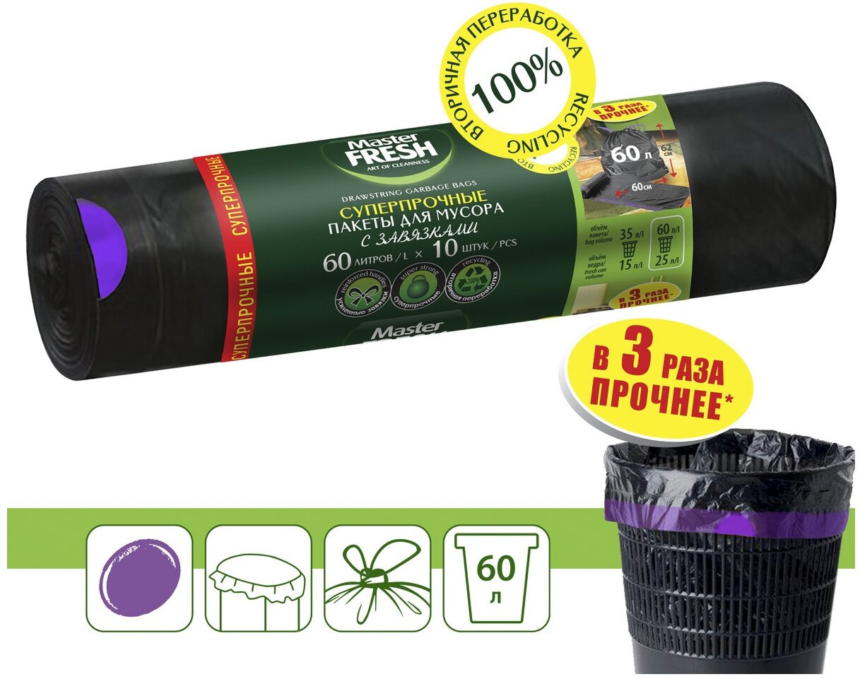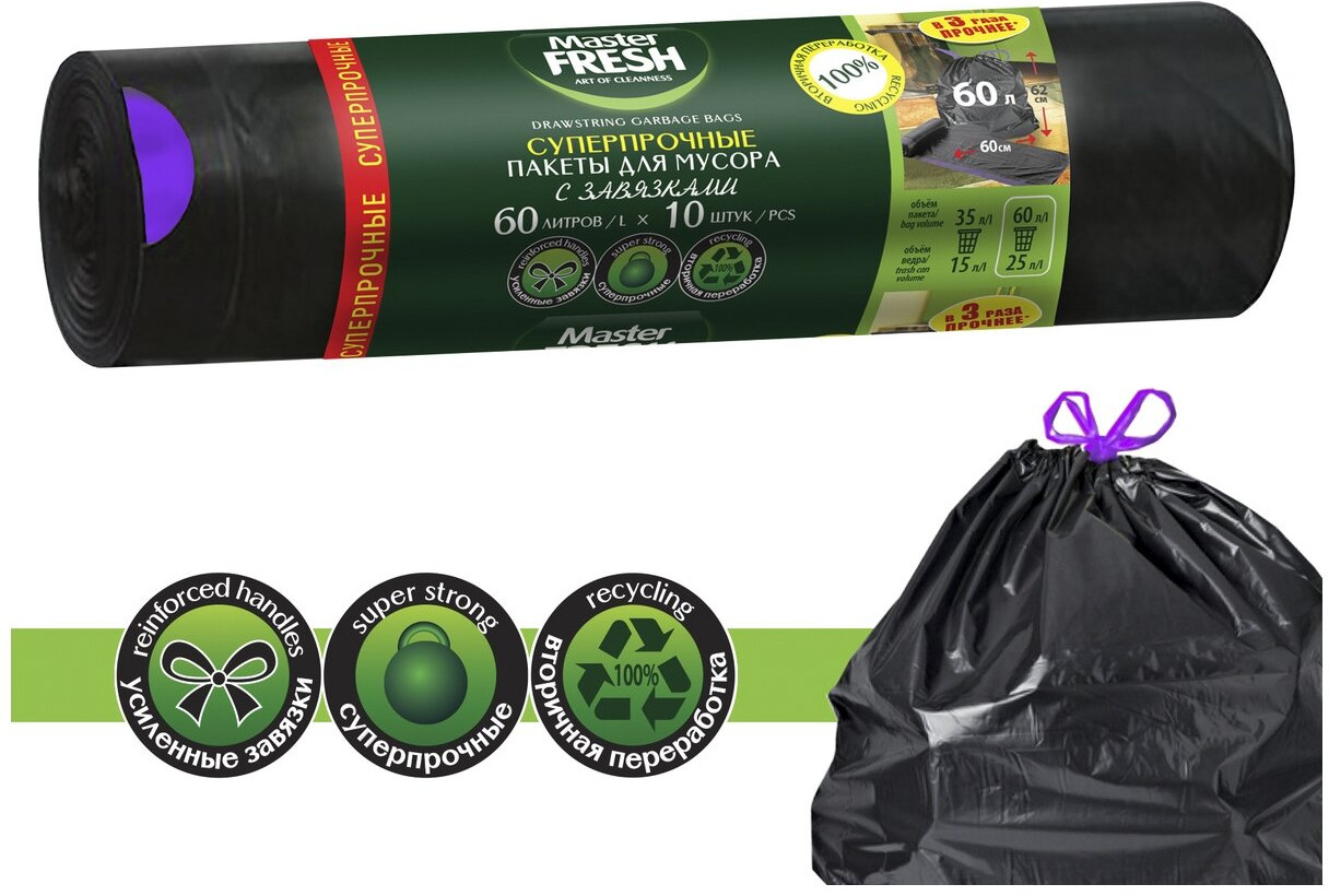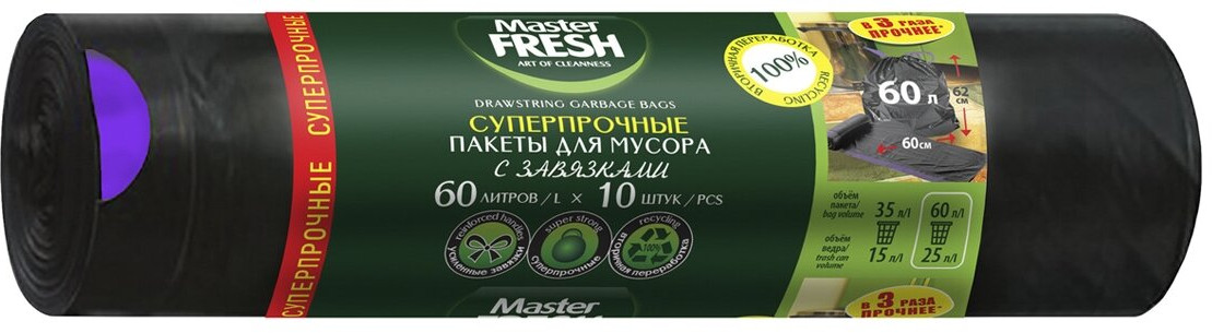Master Fresh Пакеты для мусора суперпрочные с завязками, усиленное дно-20% +24