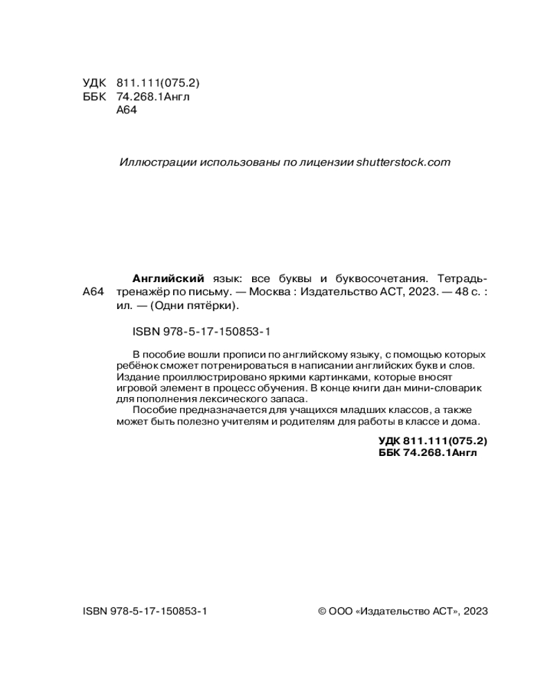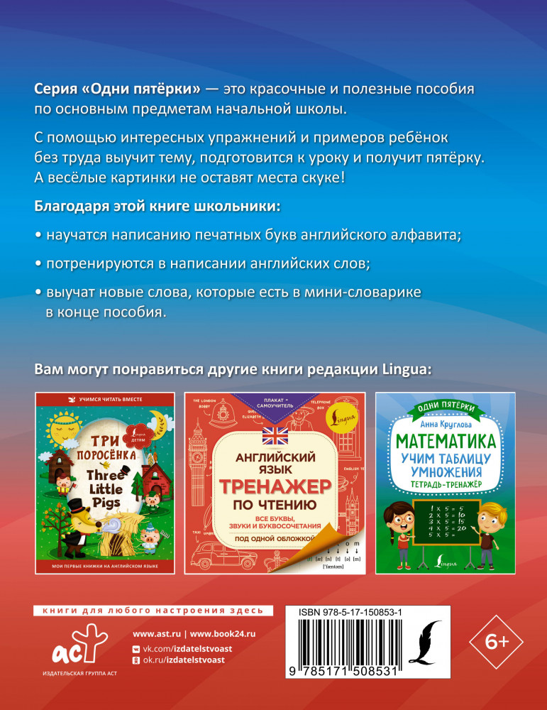 Английский язык: все буквы и буквосочетания. Тетрадь-тренажёр по письмуВ данный момент этот товар отсутствует в продаже. Возможно, у нас найдется аналогичный или похожий товар здесь. Серия: Одни пятёрки В пособие вошли прописи по английскому языку, с помощью которых ребёнок сможет потренироваться в написании английских букв и слов. Издание проиллюстрировано яркими картинками, которые вносят игровой элемент в процесс обучения. В конце книги дан мини-словарик для пополнения лексического запаса. |