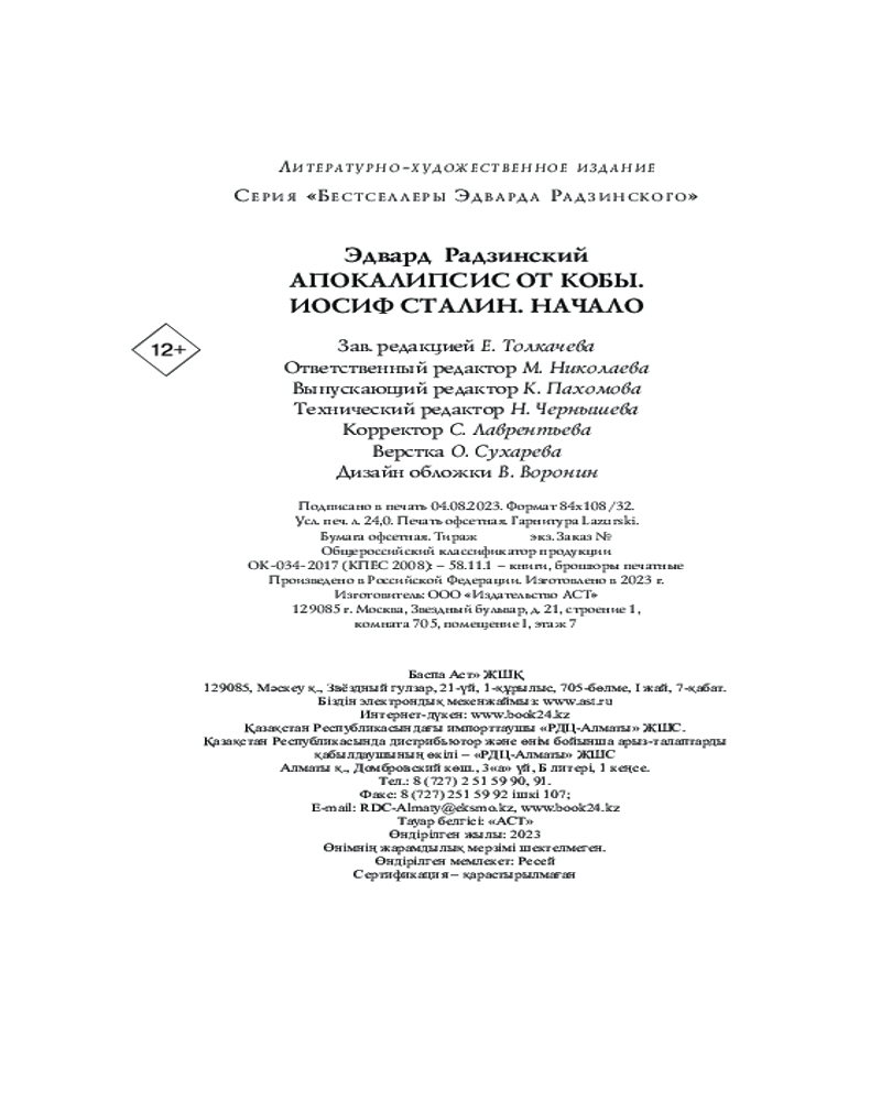 💳 Оплатить за товар можно при получении 🇰🇿 Есть бесплатная доставка по Казахстану от 1 дня 🎁 Копите бонусы с каждой покупки Серия: Бестселлеры Эдварда Радзинского В основе книги Эдварда Радзинского лежит некая рукопись, |