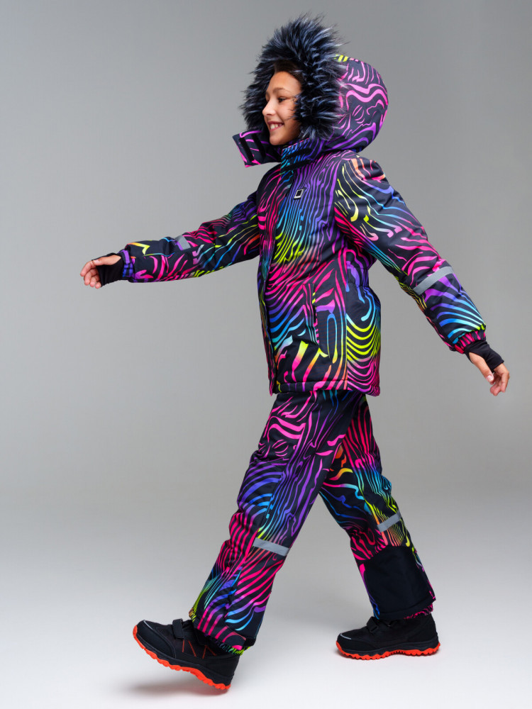 Зимний комплект из мембранной ткани 5000×5000. Линия Nord — высокая степень теплозащиты. Температурный режим до −25°С. Подкладка — флис. Материал верха с ветрозащитным и водоотталкивающим покрытием. Внутренняя ветрозащитные планки. Два боковых кармана на липучке. Внутренний карман. Съемный капюшон на кнопках. Съемный искусственный мех. Эластичные манжеты на рукавах с отверстием для большого пальца. Съёмные эластичные подтяжки у брюк. Регулировка ширины брючины липучками. Застёжка на молнию с кнопкой. Светоотражающие элементы. Температурный режим является рекомендованным, необходимо учитывать уровень активности ребенка и многослойность поддевочной одежды.
