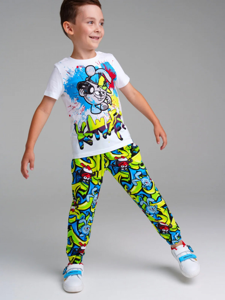 Комплект: футболка и брюки. Выполнен из эластичного и приятного на ощупь трикотажа. Брюки с карманами в боковых швах. Эластичный пояс со шнурком. Эластичные манжеты по низу брючин. Высокое содержание хлопка 95%. Благодаря наличию эластана в составе ткани, изделие держит форму и меньше мнется.