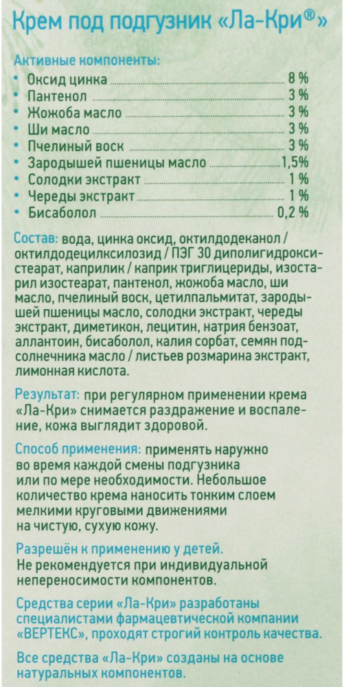 Ла-Кри Крем под подгузникВ данный момент этот товар отсутствует в продаже. Возможно, у нас найдется аналогичный или похожий товар здесь. Серия: Smart care Мягкий и питательный крем на основе натуральных компонентов для бережной защиты кожи ребенка в зоне под подгузником. Создает защитную пленку, снимает раздражение, предотвращает появление опрелостей, смягчает и питает кожу. Назначение: раздражение в зоне под подгузником, потница, профилактика опрелостей. Разрешён к применению у детей с рождения. |