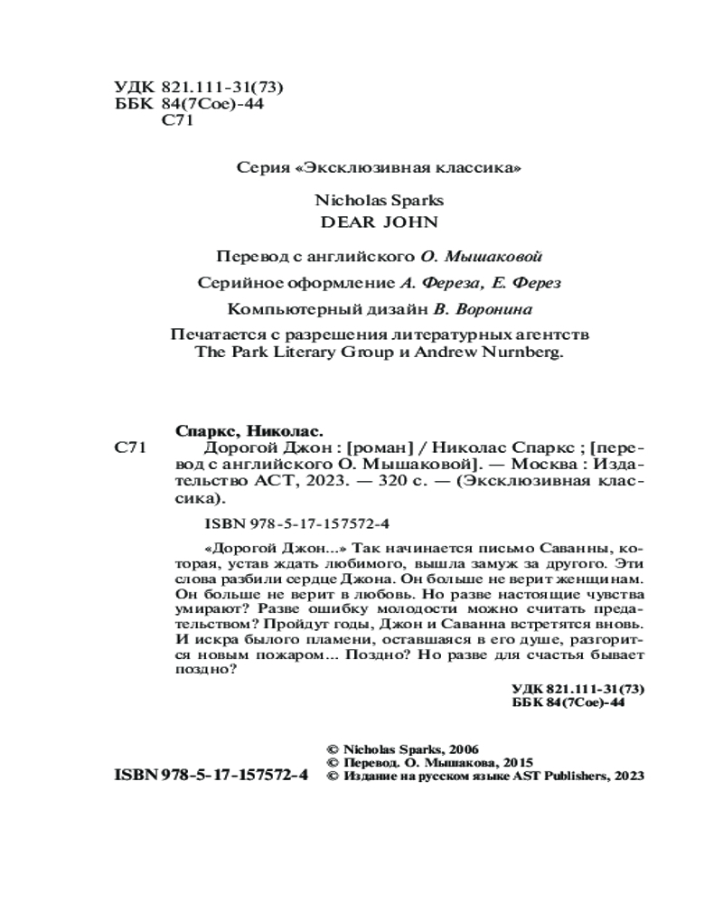 💳 Оплатить за товар можно при получении 🇰🇿 Есть бесплатная доставка по Казахстану от 1 дня 🎁 Копите бонусы с каждой покупки Серия: Эксклюзивная классика «Дорогой Джон...» Так начинается письмо Саванны, которая, устав ждать любимого, вышла замуж за другого. Эти слова разбили сердце Джона. Он больше не верит женщинам. Он больше не верит в любовь. Но разве настоящие чувства умирают? Разве ошибку молодости можно считать предательством? Пройдут годы, Джон и Саванна встретятся вновь. И искра былого пламени, оставшаяся в его душе, разгорится новым пожаром... Поздно? Но разве для счастья бывает поздно? |