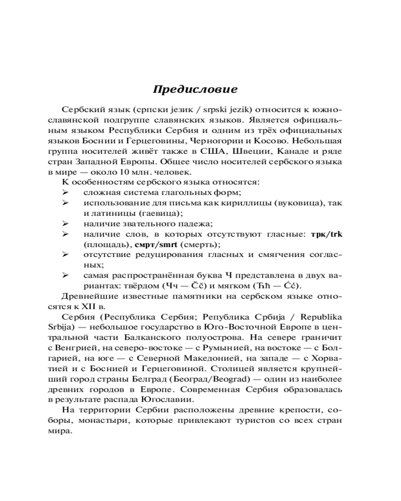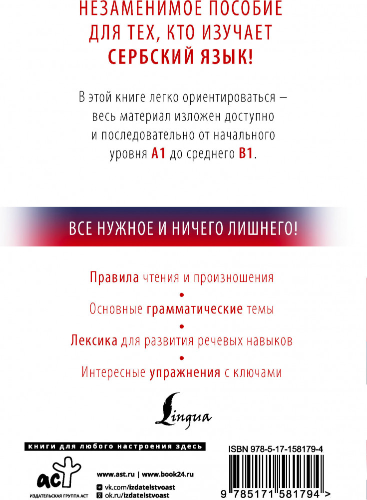 💳 Оплатить за товар можно при получении 🇰🇿 Есть бесплатная доставка по Казахстану от 1 дня 🎁 Копите бонусы с каждой покупки Серия: Иностранный с нуля Пособие «Сербский с нуля» поможет читателям самостоятельно овладеть сербским языком на начальном уровне. Самоучитель состоит из 30-ти уроков, которые включают в себя 30 основных грамматических тем, большое количество наглядных таблиц и полезную лексику для повседневного использования. Каждый урок содержит упражнения для успешного закрепления пройденной темы, ответы на которые расположены в конце книги. А небольшие страноведческие вставки помогут расслабиться перед изучением новой темы и узнать больше о культуре прекрасной Сербии! |