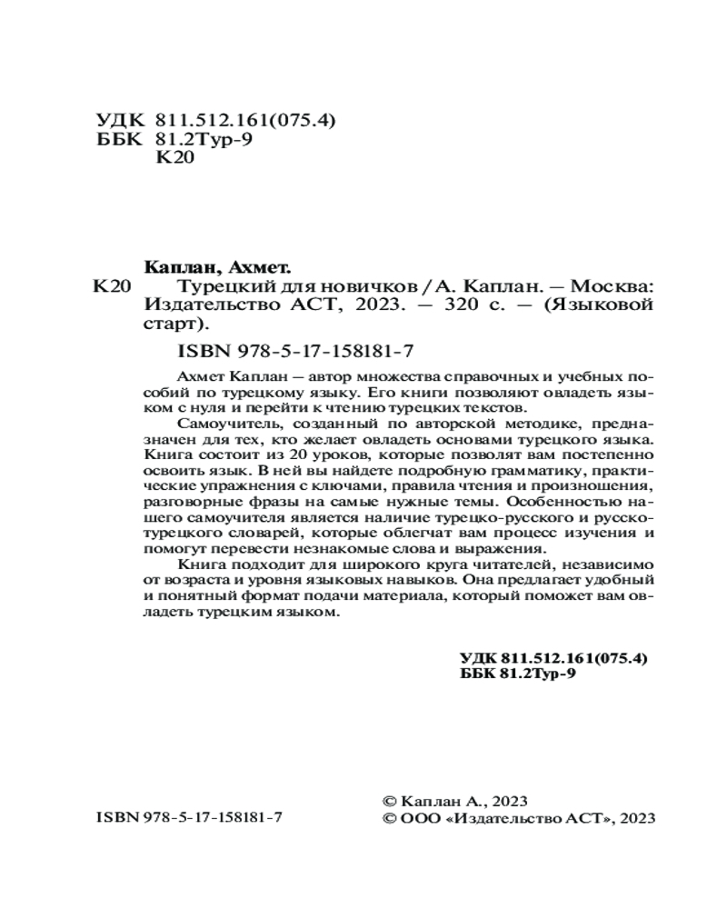 💳 Оплатить за товар можно при получении 🇰🇿 Есть бесплатная доставка по Казахстану от 1 дня 🎁 Копите бонусы с каждой покупки Серия: Языковой старт Ахмет Каплан — автор множества справочных и учебных пособий по турецкому языку. Его книги позволяют овладеть языком с нуля и перейти к чтению турецких текстов. |