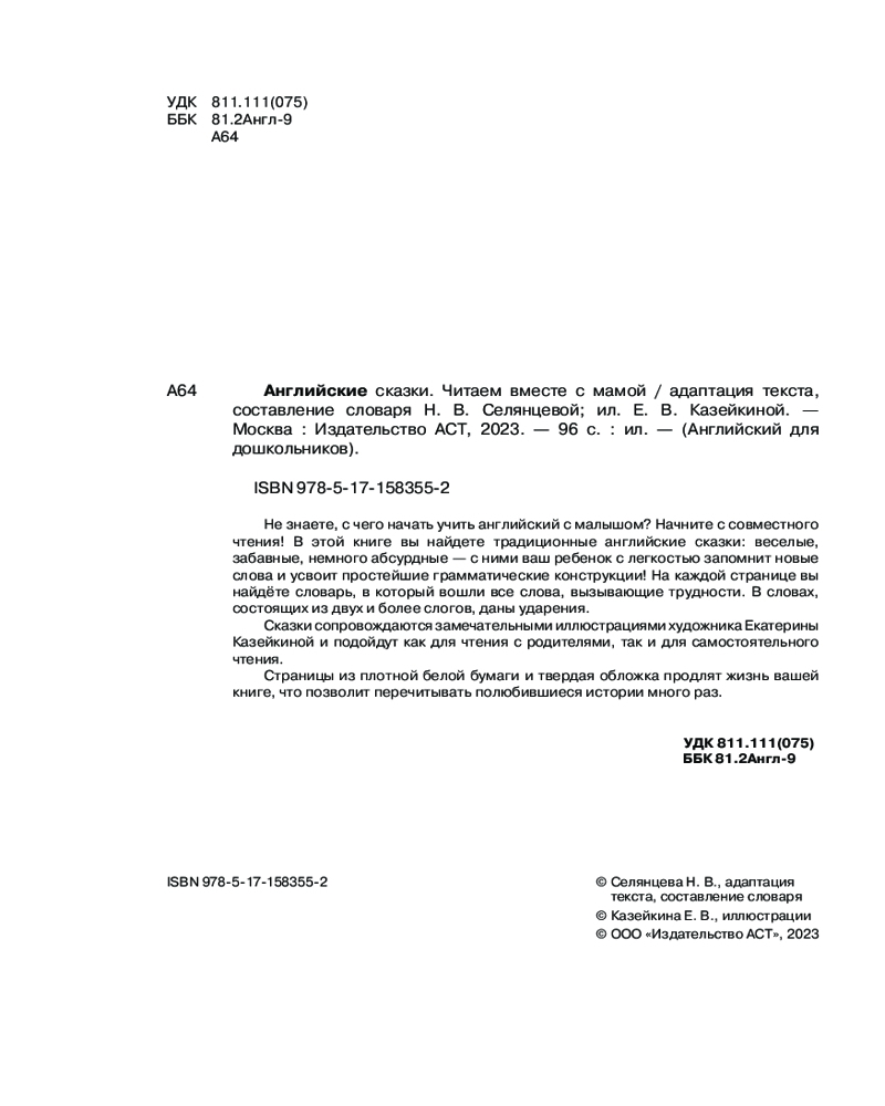 💳 Оплатить за товар можно при получении 🇰🇿 Есть бесплатная доставка по Казахстану от 1 дня 🎁 Копите бонусы с каждой покупки Серия: Английский для дошкольников Не знаете, с чего начать учить английский с малышом? Начните с совместного чтения! В этой книге вы найдете традиционные английские сказки: веселые, забавные, немного абсурдные — с ними ваш ребенок с легкостью запомнит новые слова и усвоит простейшие грамматические конструкции! На каждой странице вы найдёте словарь, в который вошли все слова, вызывающие трудности. В словах, состоящих из двух и более слогов, даны ударения. |