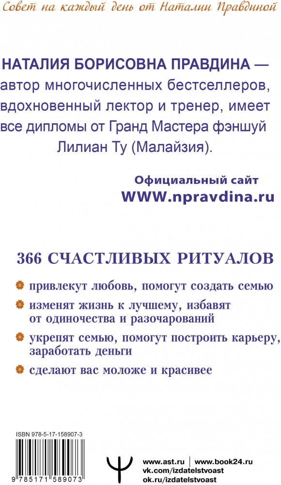 В данный момент этот товар отсутствует в продаже. Возможно, у нас найдется аналогичный или похожий товар здесь. Серия: Совет на каждый день от Натальи Правдиной Согласно Ведам, древнеиндийским текстам, Луна усиливает внутреннюю «тонкую» энергию женщины. Женщина, живущая по лунному календарю, всегда прекрасна! Луна — это сила, тайна и мудрость. Согласуя свою жизнь с лунным календарем, вы раскрываете в себе Женщину-Богиню!