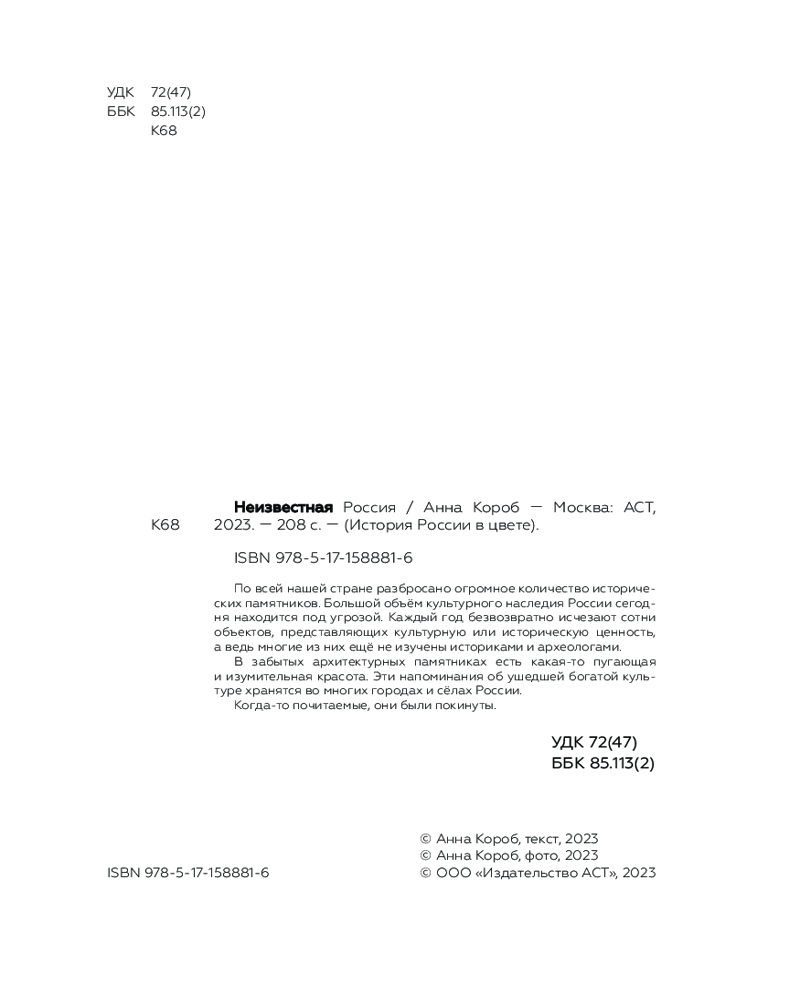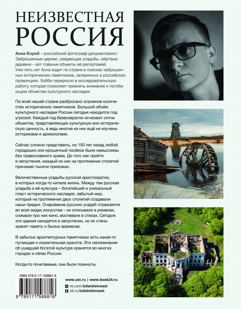 💳 Оплатить за товар можно при получении 🇰🇿 Есть бесплатная доставка по Казахстану от 1 дня 🎁 Копите бонусы с каждой покупки Серия: История России в цвете Анна Короб — российский фотограф-документалист. Заброшенные церкви, увядающие усадьбы, мёртвые деревни — вот главные объекты её репортажей. Уже пять лет Анна ездит по стране в поисках заброшенных исторических памятников, затерянных в российских провинциях. Хобби переросло в исследовательскую работу, которая позволяет привлечь внимание к погибающим объектам культурного наследия. |