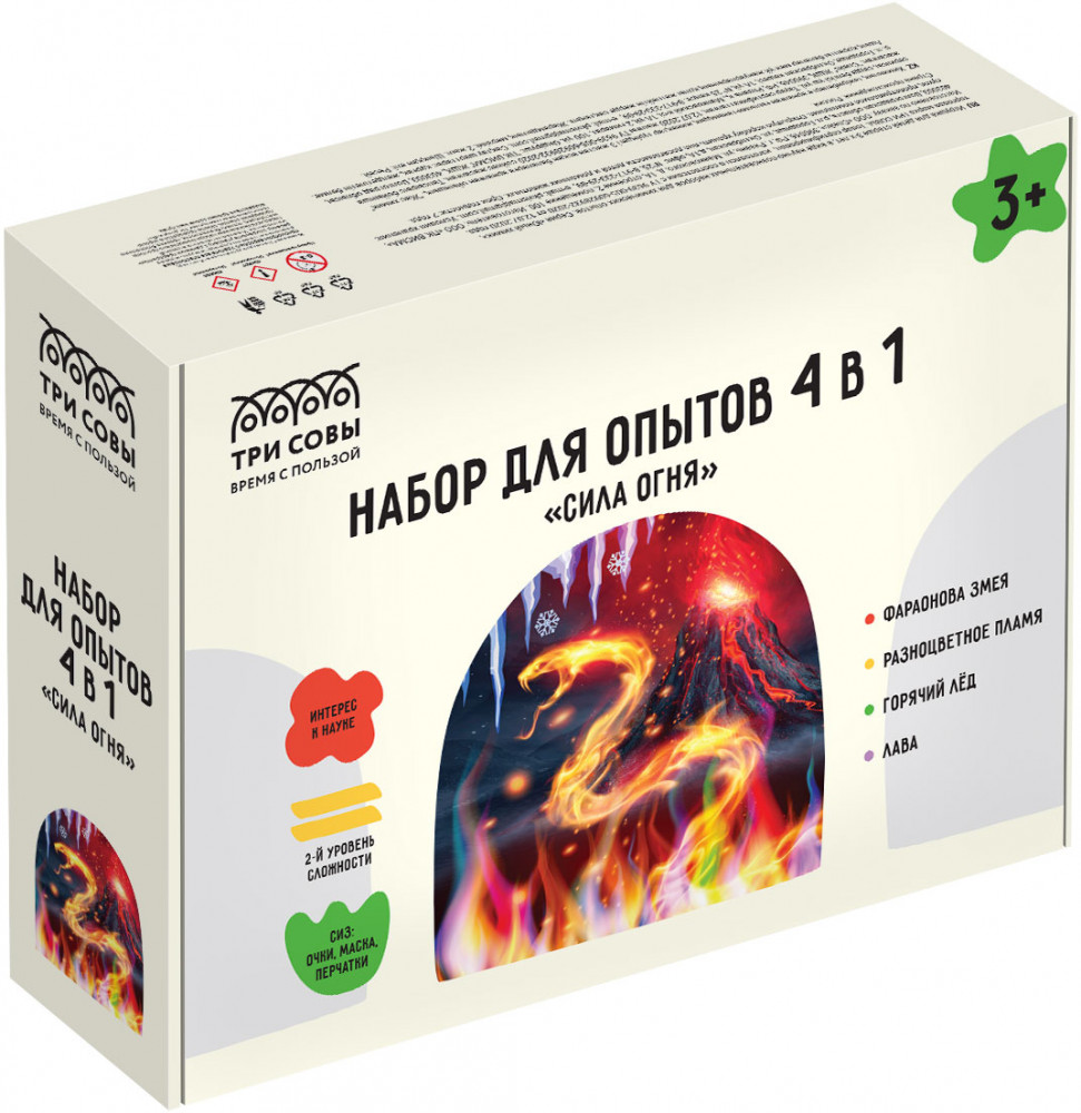 Три совы Набор для опытов 4 в 1 «Сила огня»В данный момент этот товар отсутствует в продаже. Возможно, у нас найдется аналогичный или похожий товар здесь. Набор включает в себя четыре красочных опыты: фараонова змея, разноцветное пламя, горячий лед, лава. Набор для опытов познакомит ребенка с химическими и физическими законами, разовьет любознательность, позволит самостоятельно провести первые научные эксперименты дома! Подготовка опытов не займет много времени и не потребует усилий. Подробная инструкция с указанием техники безопасности и пошаговыми действиями, а также средства индивидуальной защиты (очки, перчатки, маска) входят в состав набора. |