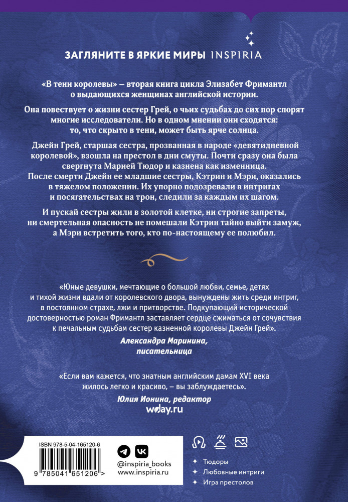 «Юные девушки, мечтающие о большой любви, семье, детях и тихой жизни вдали от королевского двора, вынуждены жить среди интриг, в постоянном страхе, лжи и притворстве. Подкупающий исторической достоверностью роман Фримантл заставляет сердце сжиматься от сочувствия к печальным судьбам сестер казненной королевы Джейн Грей». — Александра Маринина, писательница