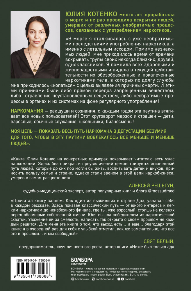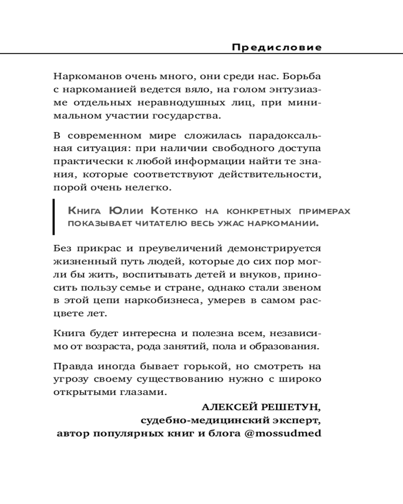 «Книга Юлии Котенко на конкретных примерах показывает читателю весь ужас наркомании. Здесь без прикрас и преувеличений демонстрируется жизненный путь людей, которые до сих пор могли бы жить, воспитывать детей и внуков, приносить пользу семье и стране, однако стали звеном в этой цепи наркобизнеса, умерев в самом расцвете лет. Книга будет интересна и полезна всем, независимо от возраста, рода занятий, пола и образования. Правда иногда бывает горькой, но смотреть на угрозу своему существованию нужно с широко открытыми глазами». — Алексей Решетун, судебно-медицинский эксперт, автор популярных книг и блога mossudmed
