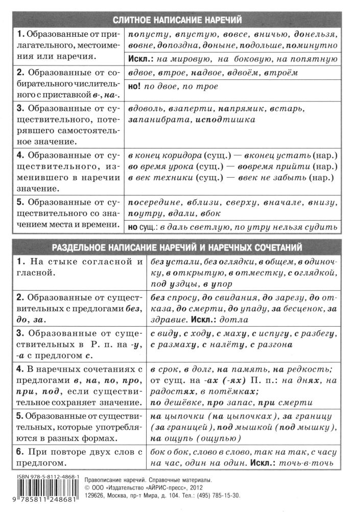 Правописание наречий. Наглядно-раздаточное пособиеВ данный момент этот товар отсутствует в продаже. Возможно, у нас найдется аналогичный или похожий товар здесь. Серия: Справочные материалы Со временем правила забываются, грамотность школьников при этом резко понижается. Основная задача наглядного пособия — напомнить, закрепить и частично расширить сведения, полученные школьниками на уроках русского языка. Структура справочных материалов, емкость и стиль изложения, удобный формат будут способствовать четкому запоминанию и помогут самостоятельно подготовиться к диктанту, сочинению, контрольной работе. Оно будет незаменимо при подготовке к ГИА или ЕГЭ. |