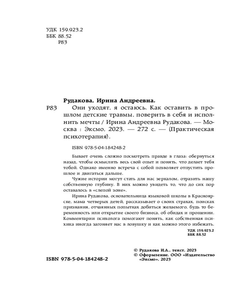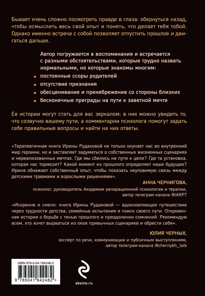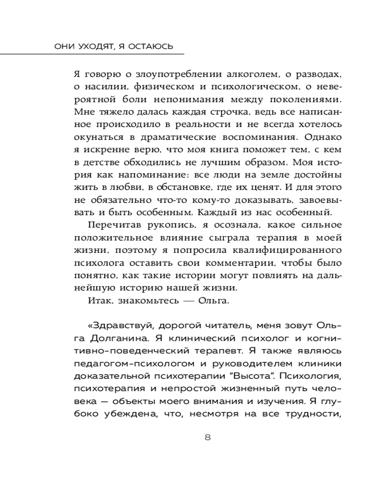 Они уходят, я остаюсь. Как оставить в прошлом детские травмы, поверить в себя и исполнить мечтыВ данный момент этот товар отсутствует в продаже. Возможно, у нас найдется аналогичный или похожий товар здесь. Серия: Практическая психотерапия Бывает очень сложно посмотреть правде в глаза: обернуться назад, чтобы осмыслить весь свой опыт и понять, что делает тебя тобой. Однако именно встреча с собой позволяет отпустить прошлое и двигаться дальше. |