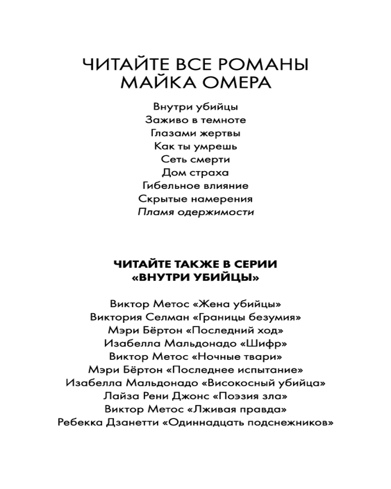 Книга очень интересная. Майк Омер, как всегда, "на высоте" оценок. Сюжет выстроен так, что интерес возникает сразу и длится до конца книги. Развязка весьма неожиданная. Детектив СУПЕР!!